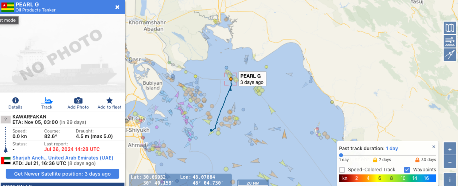 بررسی‌های ایران اینترنشنال نشان می‌دهد این نفت‌کش در تاریخ چهارم مرداد از محل خود در آب‌های آزاد به سمت آب‌های ایران حرکت و از روز پنجم مرداد در داخل آب‌های ایران توقف کرده‌است.