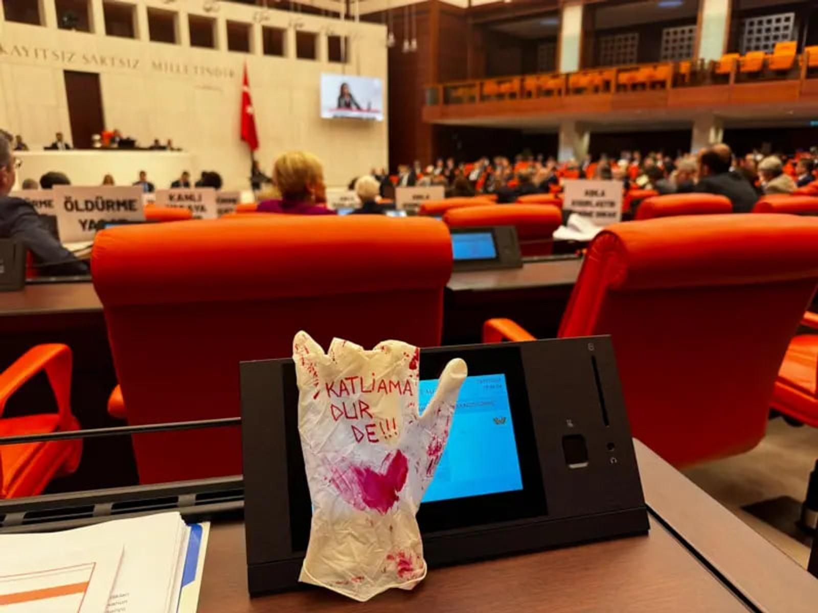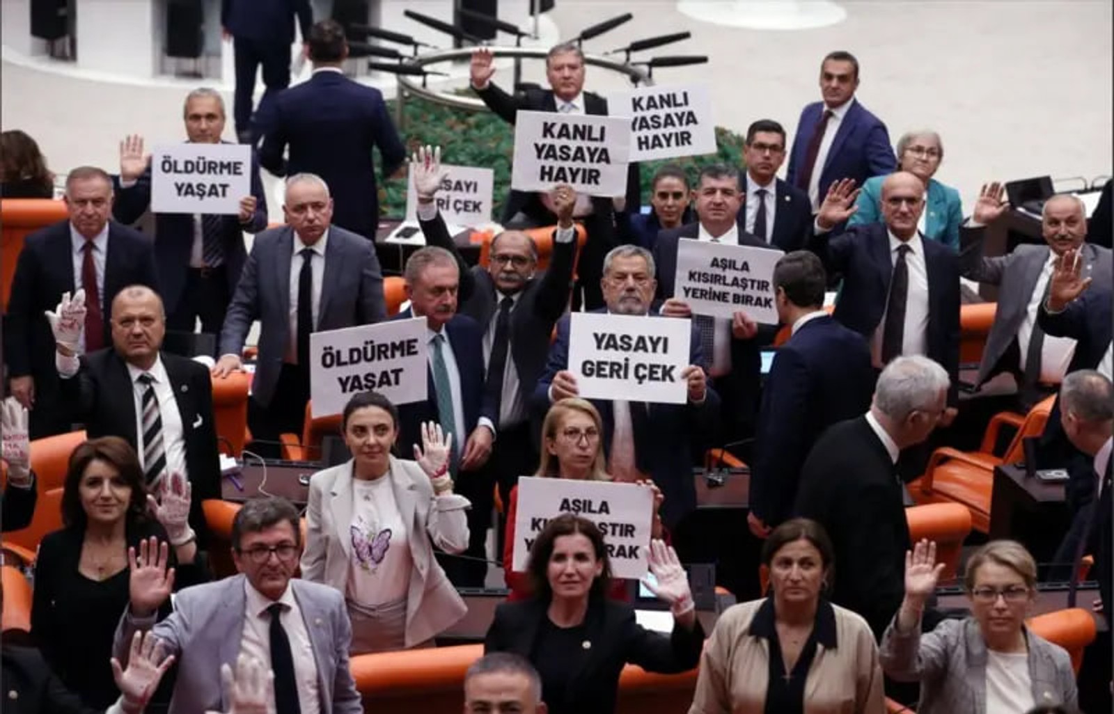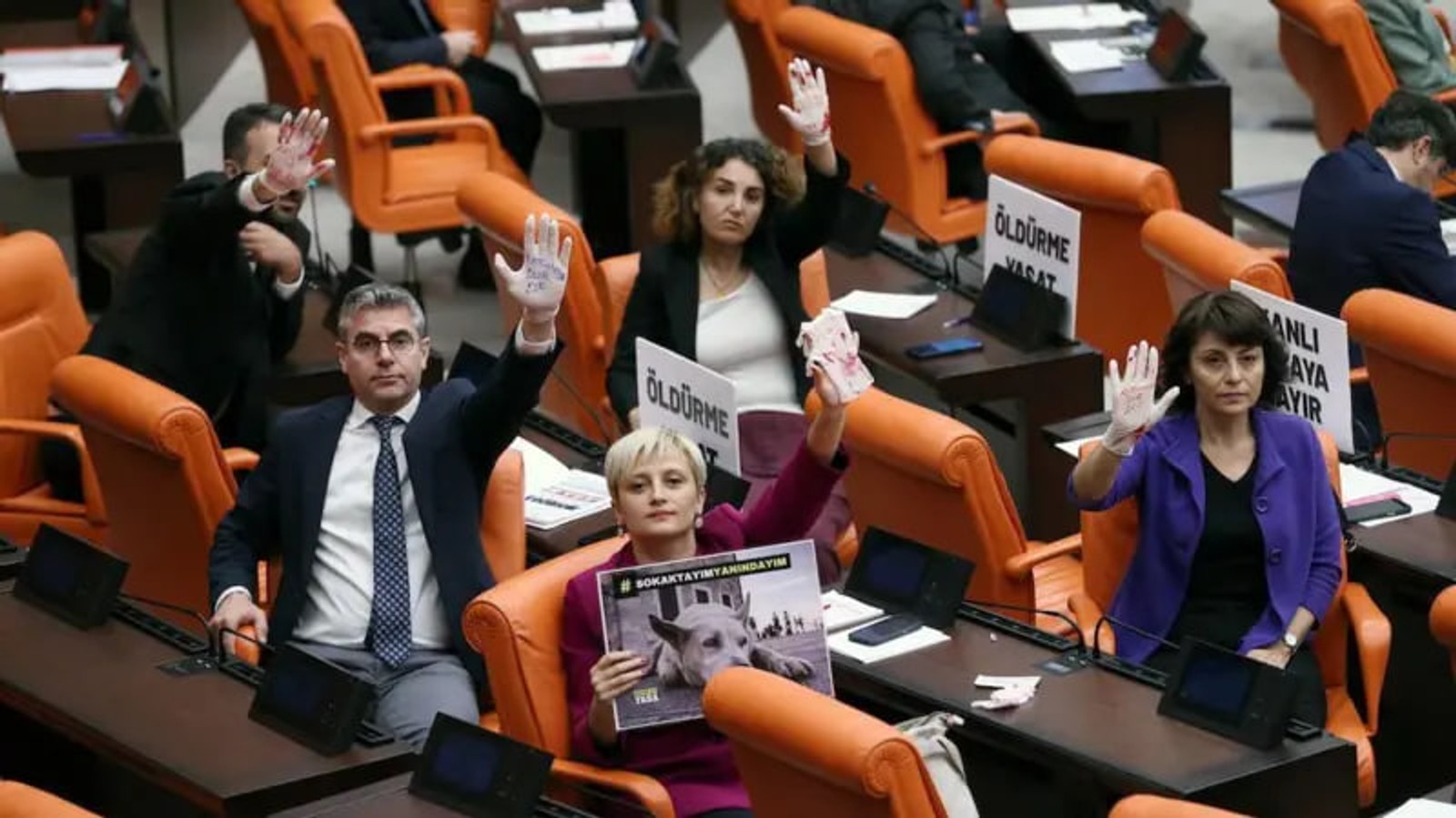 عالیه تیمیسی اَرسِوِر، نماینده آنکارا در مجلس و عضو حزب جمهوریخواه خلق عصر روز دوشنبه هشتم مرداد در جریان بررسی لایحه با در دست داشتن تصاویری از حیوانات پشت تریبون رفت که روی آنها نوشته شده بود: «من را نکُش».