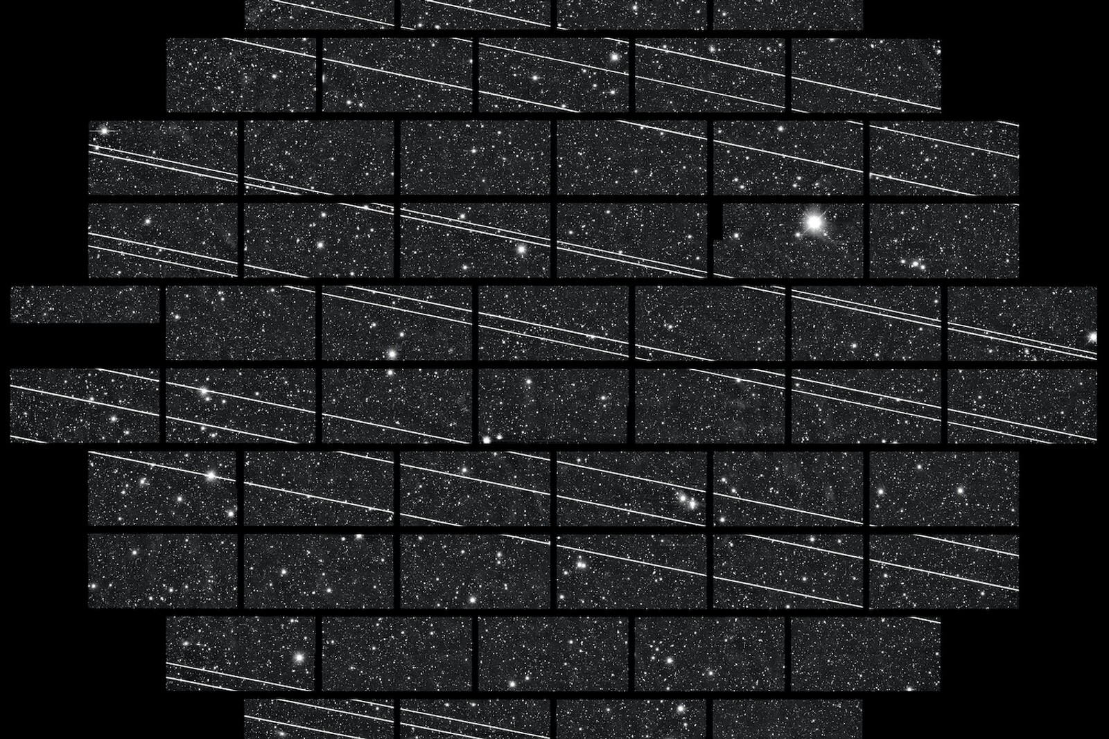 تلسکوپ سی‌تی‌ای‌او (CTIO) در شیلی، با نوردهی ۳۳۳ ثانیه‌ای، حداقل ۱۹ خط درخشان از رد ماهواره‌های استارلینک را در یک تصویر ثبت کرده است.