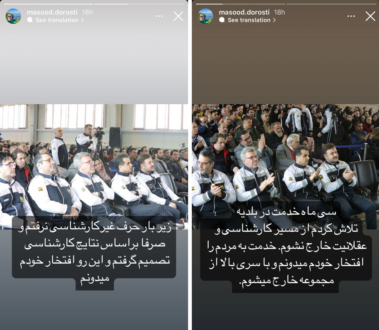 شامگاه چهارشنبه ۲۴ مرداد و پس از انتشار خبر برکناری درستی و جایگزین شدن فرزان‌پور در شرکت متروی تهران، درستی در دو استوری جداگانه در اینستاگرام، به طور غیر‌رسمی دلیل برکناری خود را «زیر بار حرف زور نرفتن» و «پافشاری بر تصمیمات کارشناسی» عنوان کرد.