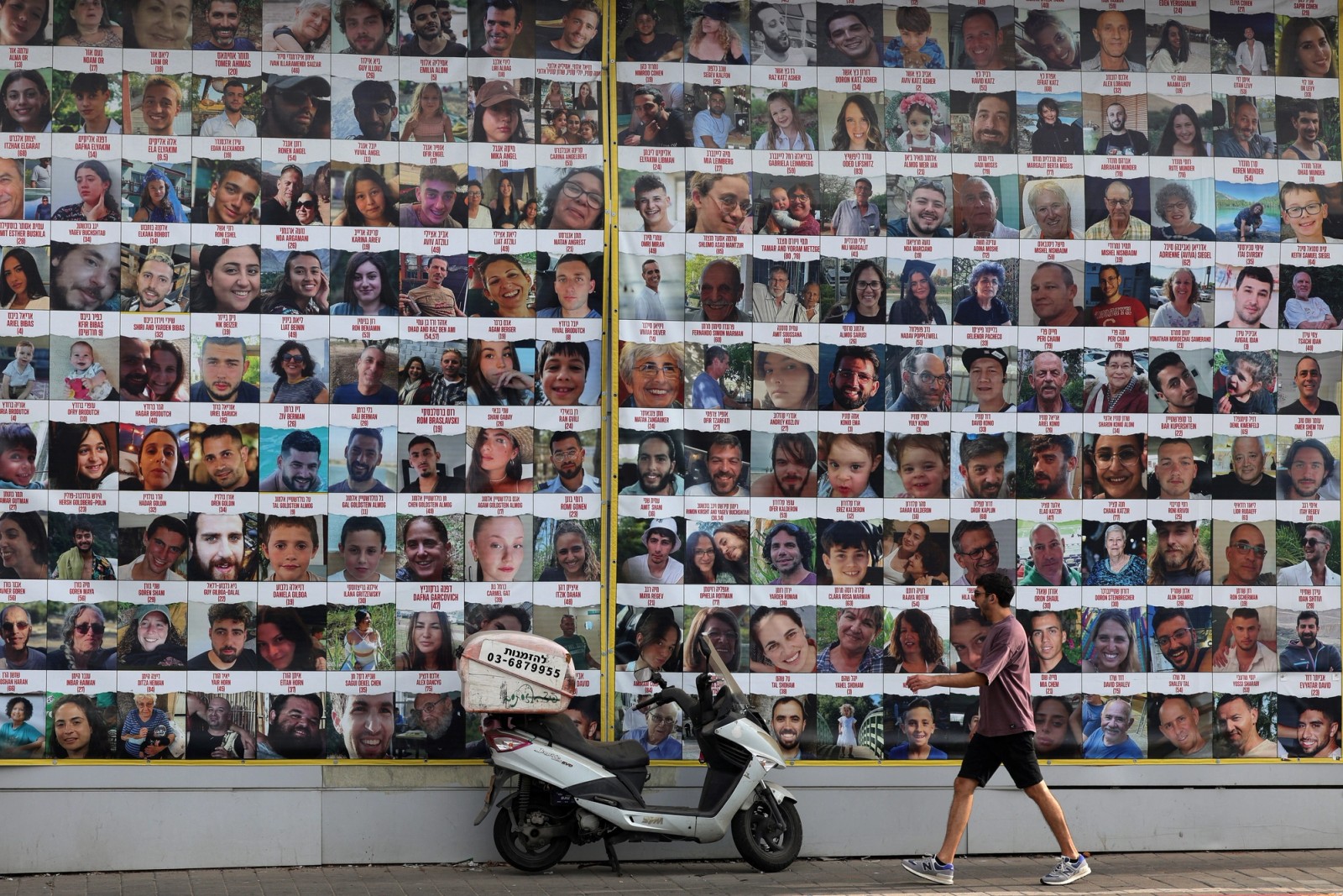 تصاویر گروگانهای اسرائیلی در بند حماس بر روی دیواری در تلآویو، ۲۸ مرداد