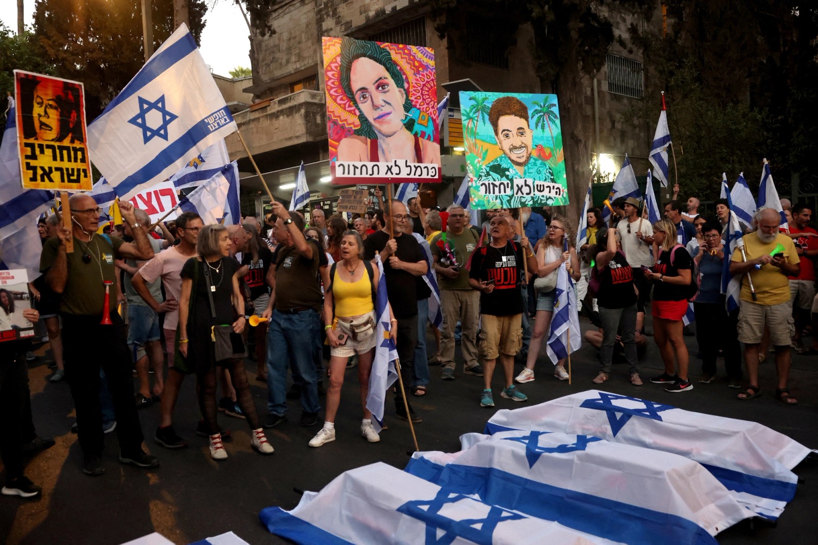 همچنین در طول روز دوشنبه هزاران نفر دوباره در تل‌آویو تجمع کردند و پرچم‌های آبی و سفید اسرائیل را به اهتزاز درآوردند یا عکس‌هایی از گروگان‌ها را حمل کردند.