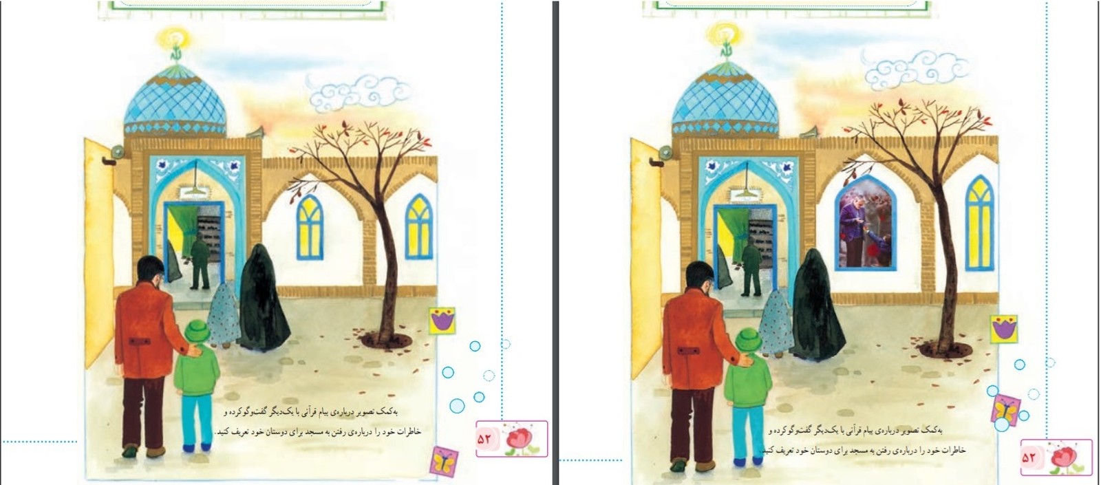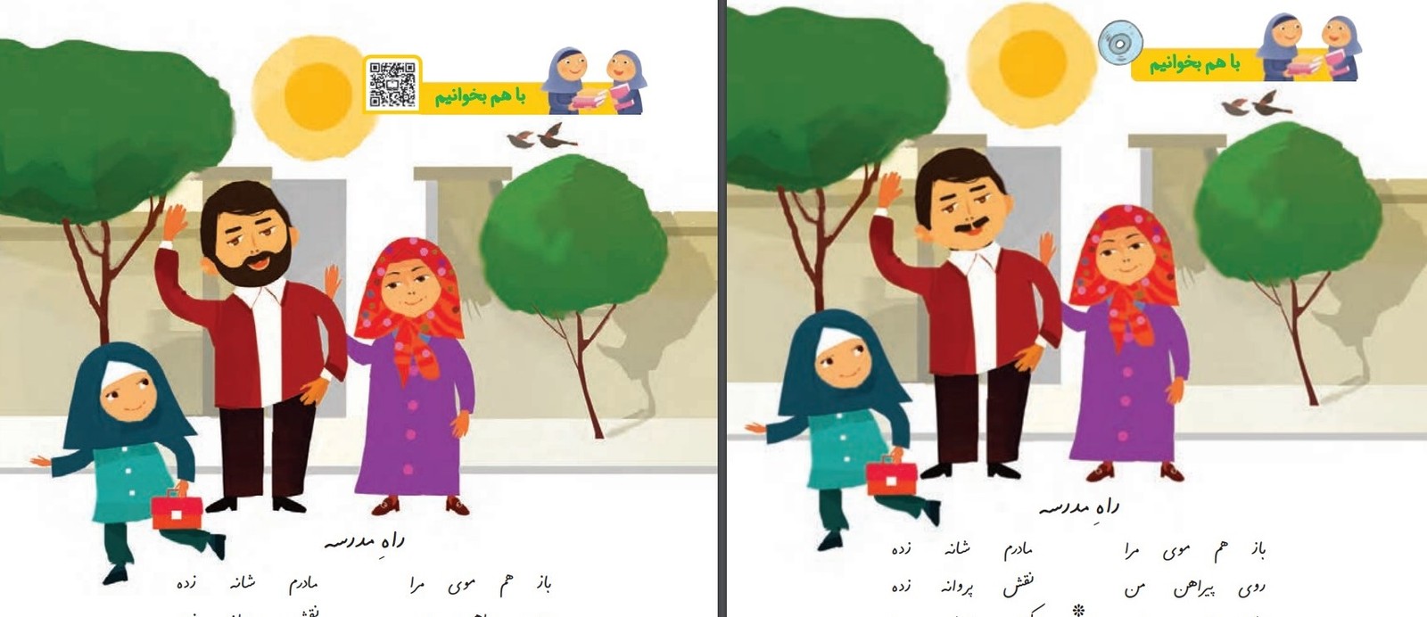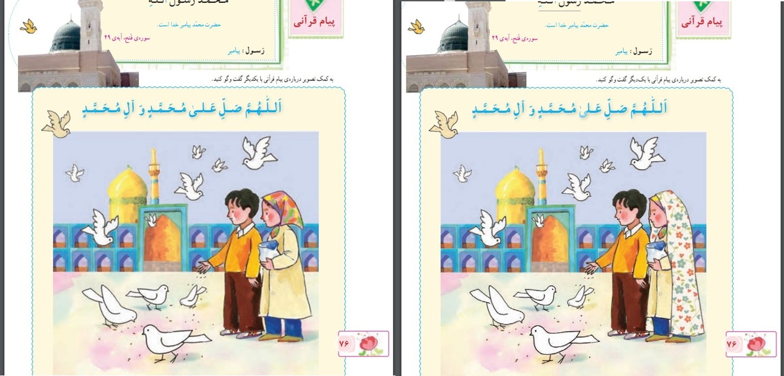 علاوه بر این در صفحه ۷۶ همین کتاب، دختری که در کنار پسربچه‌ای در حال غذا دادن به کبوترها بود، در چاپ جدید کتاب، چادر به سر کرده است.