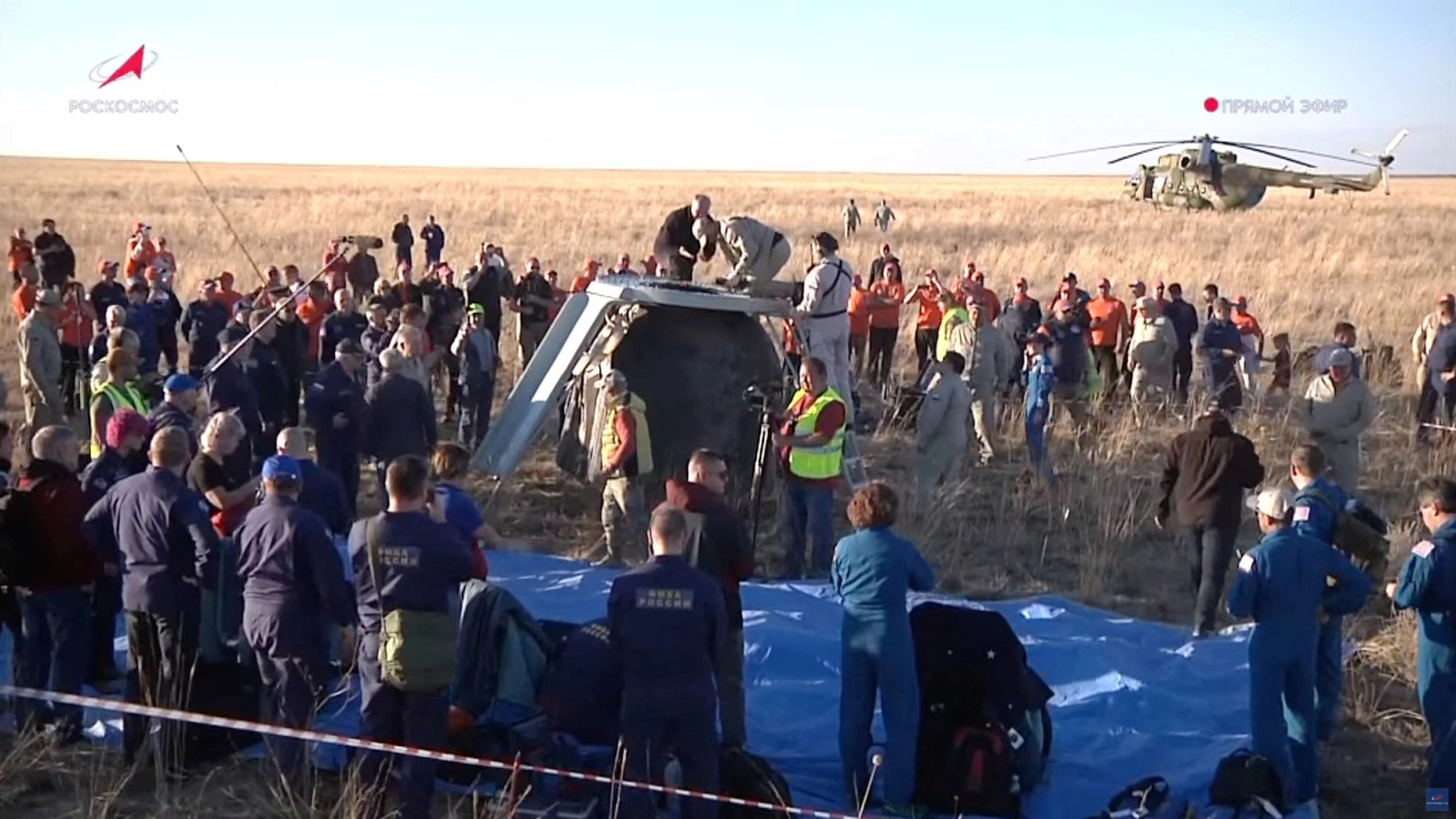 پس از فرود، فضانوردان از کپسول بیرون کشیده شدند و روی صندلی‌هایی قرار گرفتند که برای انطباق ‌آن‌ها با گرانش زمین در نظر گرفته شده بود.