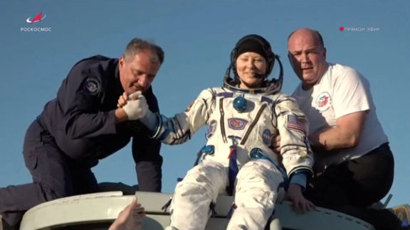 یک کپسول سایوز حامل دو فضانورد روس و یک آمریکایی در قزاقستان فرود آمد و به رکورد اقامت فضانوردان روسی در فضا پایان داد.