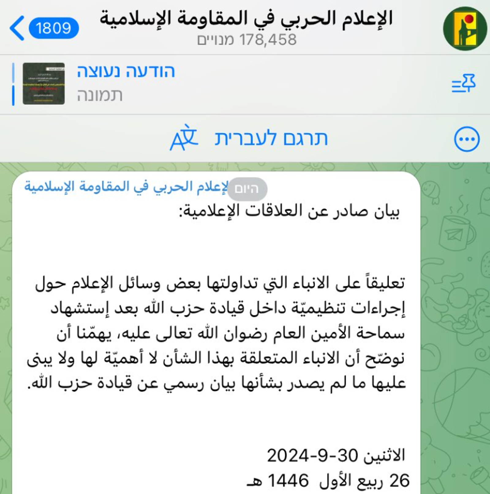 حزبالله لبنان با انتشار بیانیهای به خبرها درباره انتصاب جایگزین حسن نصرالله واکنش نشان داد و اعلام کرد برای اعلام جانشینی تنها به بیانیه رسمی این گروه مراجعه کنید.
