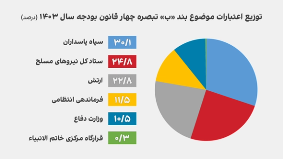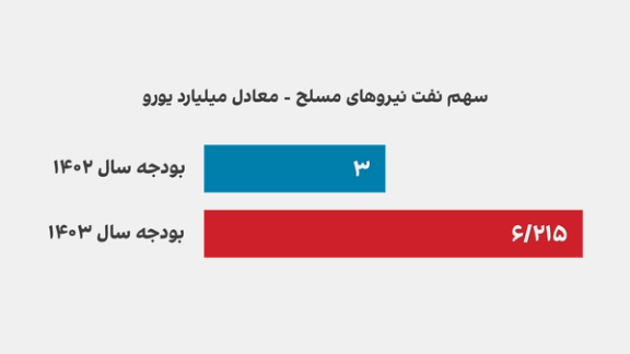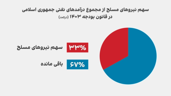 نیروهای مسلح جمهوری اسلامی طبق قانون بودجه سال ۱۴۰۳، مالک یک بشکه از هر سه بشکه نفت و فرآوردههای نفتی در ایران هستند. سهم نفت نیروهای مسلح در بودجه ۱۴۰۲ به مبلغ سه میلیارد یورو داده شده بود. این رقم در بودجه امسال به شش میلیارد و ۲۱۵ میلیون یورو افزایش یافته است. یعنی بیش از دو برابر سال گذشته.