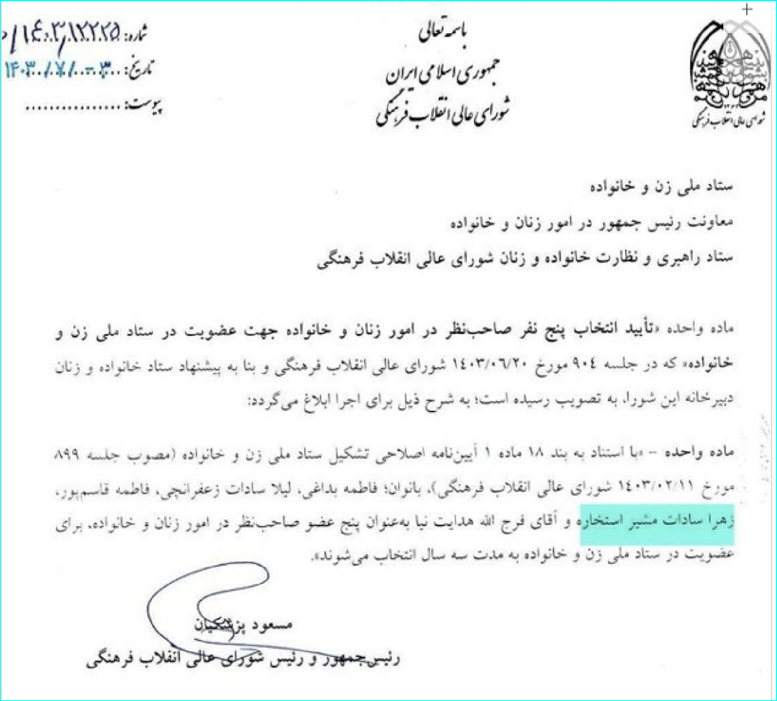 رسانههای داخلی به تازگی خبر دادند پزشکیان در مقام رییس شورای عالی انقلاب فرهنگی، در حکمی، ضمن تایید پیشنهاد ستاد خانواده و زنان شورای عالی انقلاب فرهنگی، زهرا سادات مشیر استخاره، همسر قالیباف را به عنوان یکی از پنج عضو «ستاد ملی زن و خانواده» منصوب کرده است.