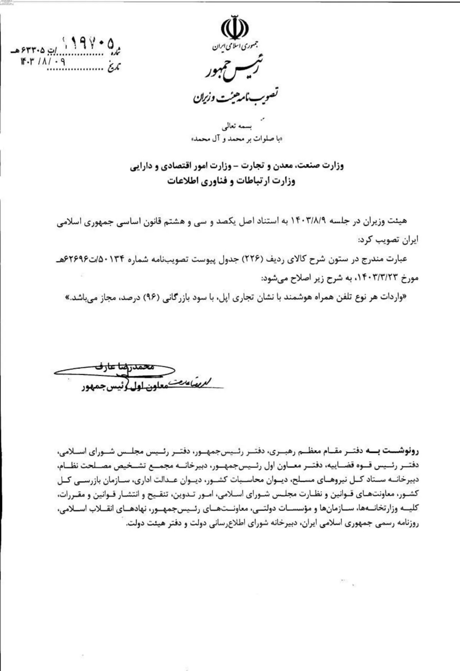 همزمان، رسانه‌های داخلی تصویر مصوبه‌ای را به تاریخ نهم آبان ۱۴۰۳ منتشر کردند. مصوبه‌ای با سربرگ ریاست جمهوری و امضای محمدرضا عارف، معاون اول مسعود پزشکیان. در این مصوبه آمده است: «واردات هر نوع تلفن همراه هوشمند با نشان تجاری اپل، با سود بازرگانی (۹۶) درصد مجاز می‌باشد.»