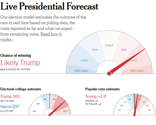 مدل پیشبینی انتخاباتی نیویورک تایمز، که بر اساس دادههای نظرسنجی، آرای گزارششده و آنچه از آرای باقیمانده انتظار میرود عمل میکند، احتمال پیروزی ترامپ را حدود ۹۰ درصد تخمین زد.