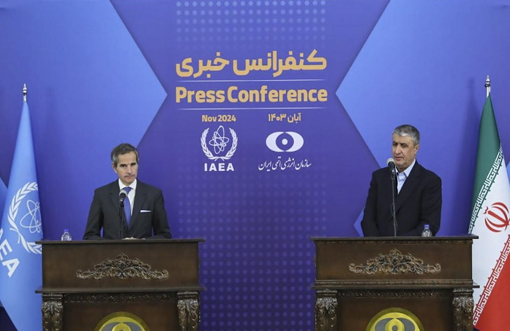 پیش از نشست خبری گروسی و اسلامی، عباس عراقچی، وزیر امور خارجه جمهوری اسلامی در دیدار با گروسی، گفت هیچ راهحل معقولی جز مذاکره برای حل مشکلات وجود ندارد اما جمهوری اسلامی اگر تحت فشار و ارعاب باشد، مذاکره نمیکند.