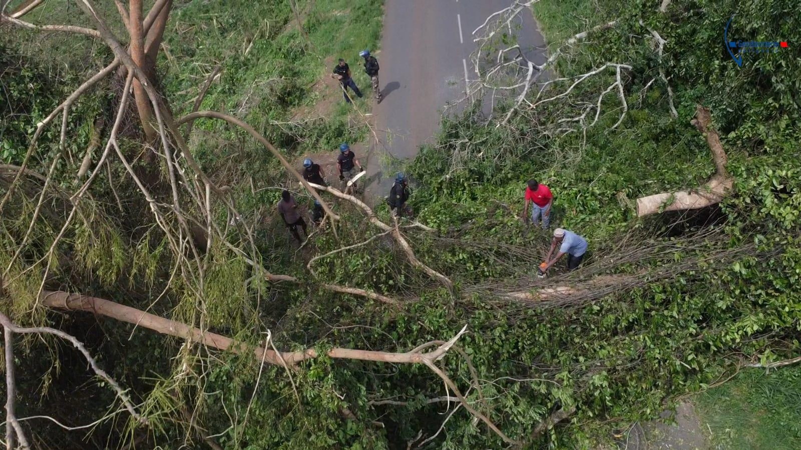 در بیمارستان مایوت، مادری با یک گهواره نوزاد در راهرویی پر از آب مشاهده شد. قایقهای پلیس واژگون شده و درختان نارگیل از سقف ساختمانها عبور کردهاند.
