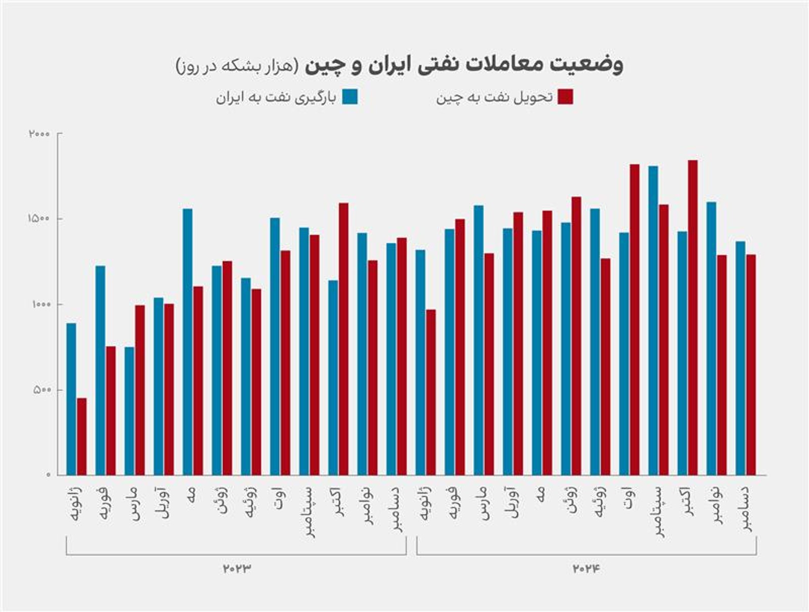 در مجموع، متوسط بارگیری روزانه نفت ایران در کل سال جاری میلادی یک میلیون و ۵۵۰ هزار بشکه بوده که نسبت به سال ۲۰۲۳ رشدی ۱۷ درصدی داشته است. حدود ۹۴ درصد از این محمولهها تحویل چین شده است.