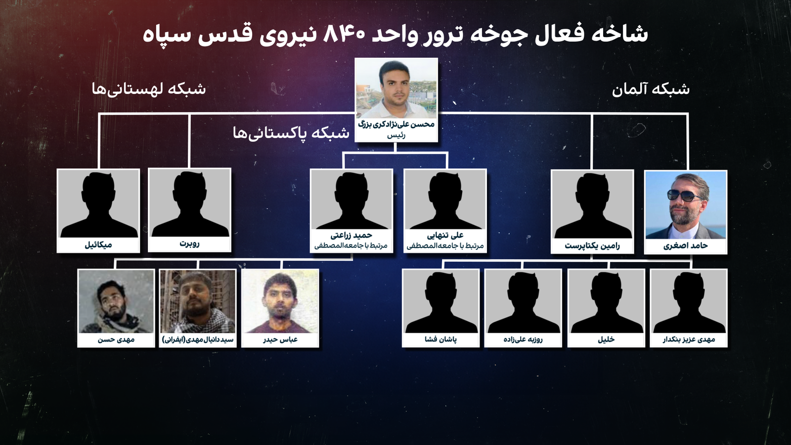 دو منبع به ایراناینترنشنال گفتند حامد اصغری، سرتیم محافظ محسن فخریزاده، چهره برجسته برنامه هستهای نظامی ایران که چهار سال پیش به دست موساد ترور شد، عضو دیگر شبکه بزرگ در واحد ۸۴۰ سپاه پاسداران است.