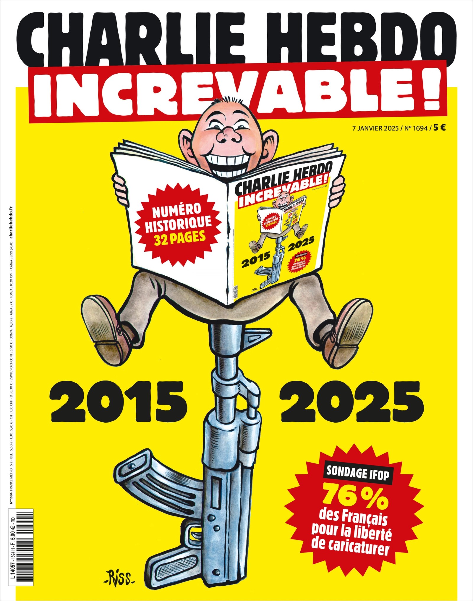 کاریکاتور روی جلد این ویژهنامه، که شامگاه دوشنبه در حساب شبکههای اجتماعی این نشریه منتشر شد، مردی را نشان میدهد که نشریه شارلی ابدو را در دست گرفته و در حالی که بر سر یک تفنگ جنگی نشسته، میخندد.