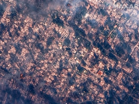 تصاویر هوایی نشان میدهد خانههای زیادی بهصورت بلوکبهبلوک تخریب شدهاند و تصاویر ماهوارهای نیز ستونهای غلیظ دود را نشان میدهند که از محل آتشها بهسمت جنوب غربی و روی اقیانوس آرام در حال حرکت است.