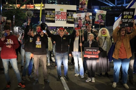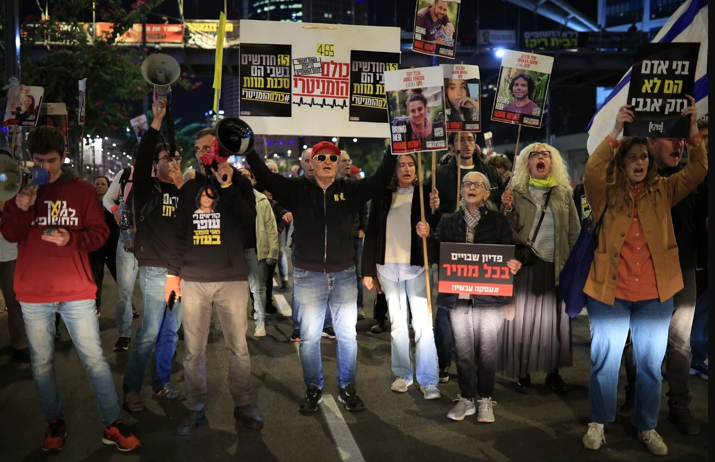 تظاهرکنندگان با در دست داشتن تابلوهایی که روی آن نوشته شده بود «شما برای تسلیم شدن به حماس مجبور نیستید»، از دولت خواستند که توافقی را برای توقف جنگ غزه امضا نکند.