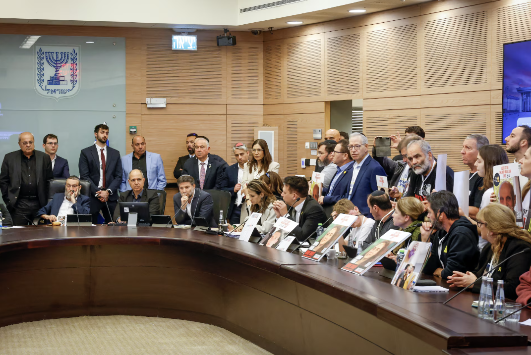 تظاهرکنندگان با در دست داشتن تابلوهایی که روی آن نوشته شده بود «شما برای تسلیم شدن به حماس مجبور نیستید»، از دولت خواستند که توافقی را برای توقف جنگ غزه امضا نکند.