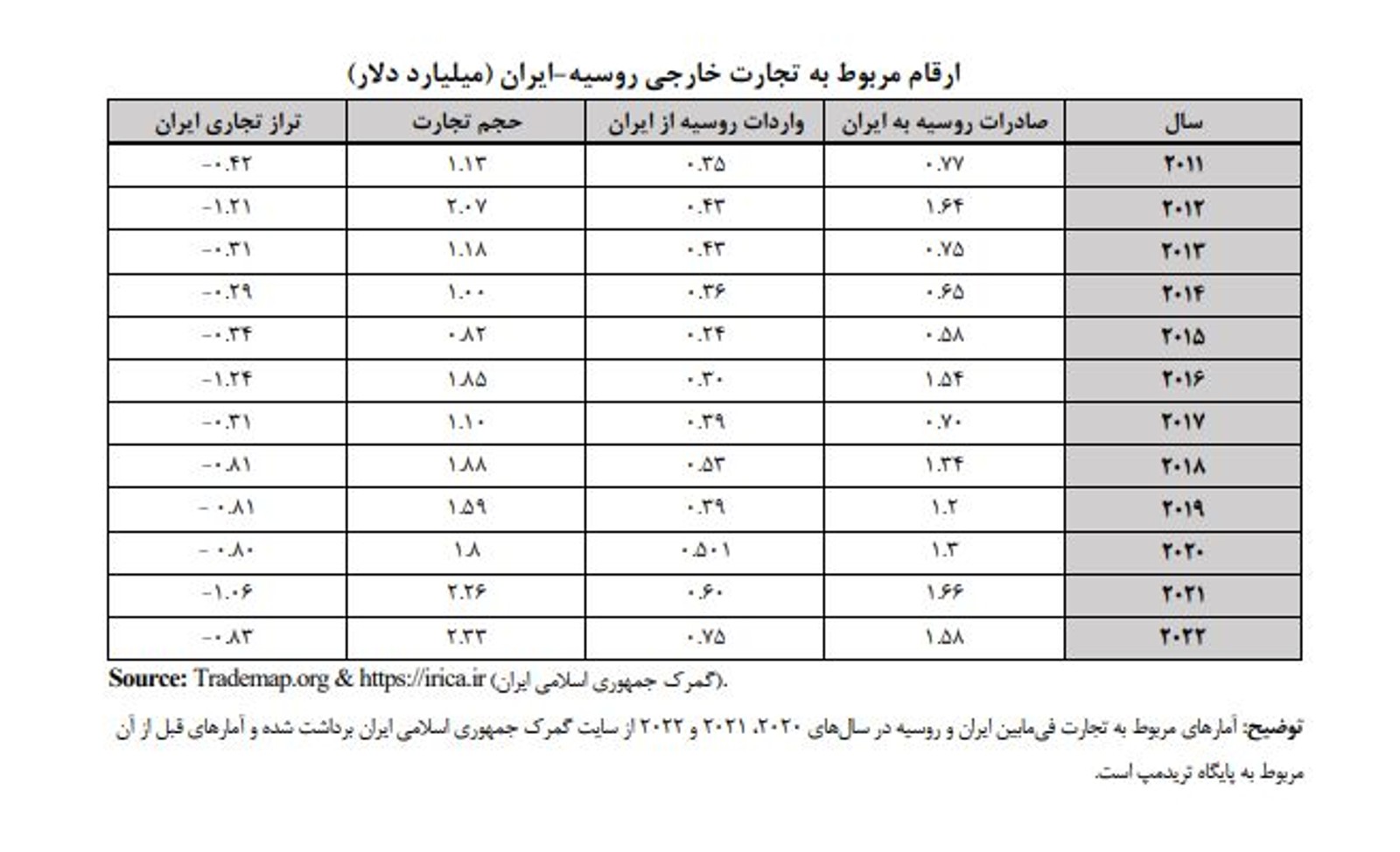 داده‌های رسمی گمرک جمهوری اسلامی هم نشان می‌دهد نه تنها در این دو مقطع، بلکه از سال ۱۳۸۹ به این سو، تراز تجاری ایران و روسیه، همواره برای ایران منفی بوده است؛ به بیانی دیگر ارزش صادرات ایران به روسیه، از ارزش واردات از این کشور کمتر بوده است.