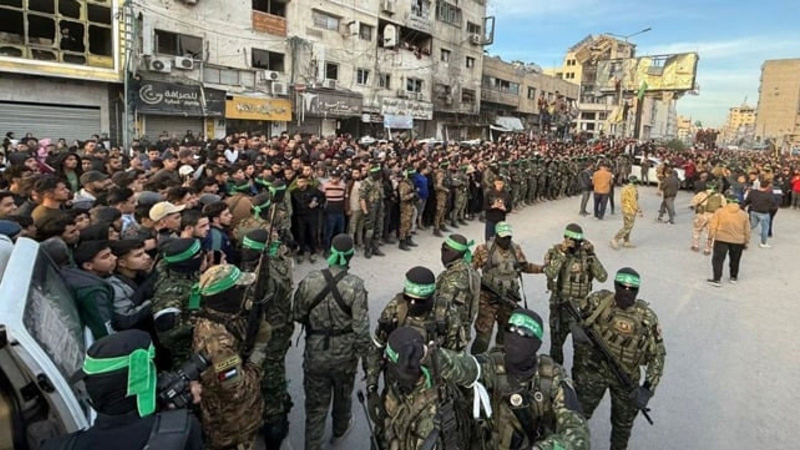 تصاویر منتشر شده از مرکز شهر غزه، حاکی از تجمع صدها نفر از فلسطینیان و افراد مسلح حماس است که در اطراف خودروهای صلیب سرخ و محل تحویل گروگانها تجمع کردهاند.