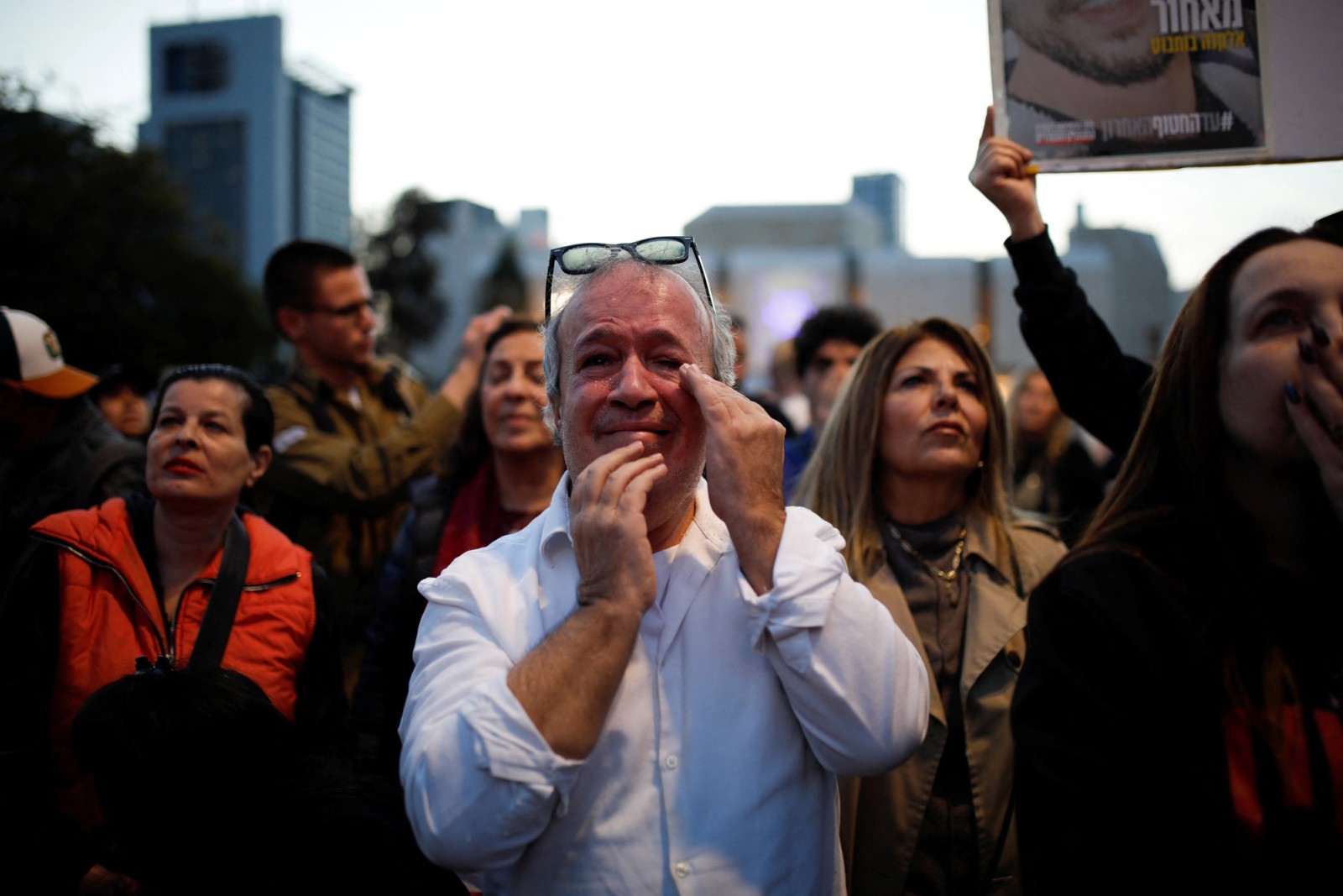 اشک شوق یک شهروند اسرائیلی در پی آزادی سه گروگان در بند حماس، تل‌آویو، ۳۰ دی