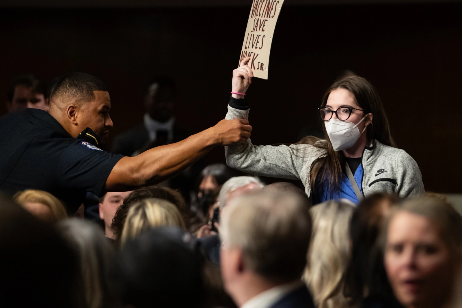 یک نیروی پلیس چهارشنبه دهم بهمن در جلسه کمیته مالی سنای آمریکا برای بررسی صلاحیت رابرت اف کندی، گزینه ترامپ به عنوان وزیر بهداشت، در حال بیرون کردن فرد معترضی است که این جلسه را مختل کرده است. این فرد در اعتراض به مواضع کندی در مخالفت با واکسیناسیون، نوشته‌ای نمایش می‌دهد که می‌گوید: «واکسن زندگی انسان‌ها را نجات می‌دهد»