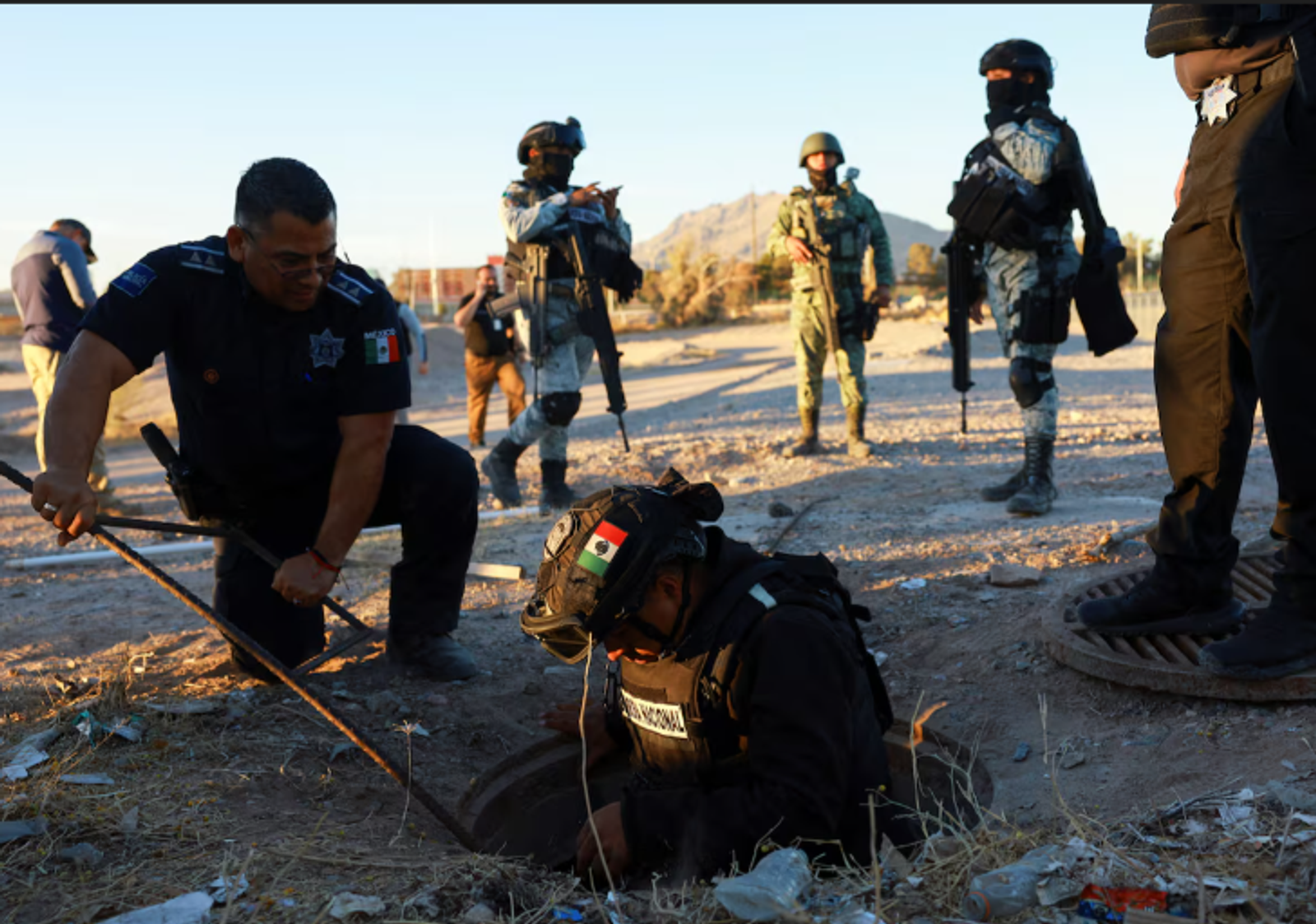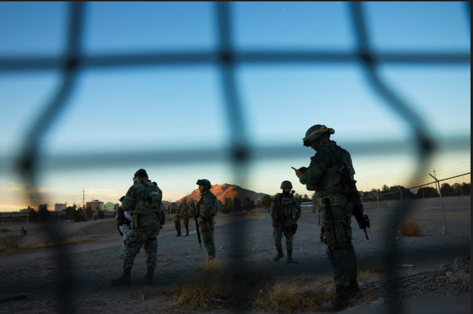 اعضای گارد ملی مکزیک، مسلح و نقابزده، در حاشیه شهر سیوداد خوارس در مرز الپاسو در ایالت تگزاس، در امتداد مانع مرزی در میان بوتهزارها به جستوجو پرداختند و نردبانها و طنابهای دستساز را که در خندقها پنهان شده بود بیرون کشیده و روی کامیونها بار زدند.