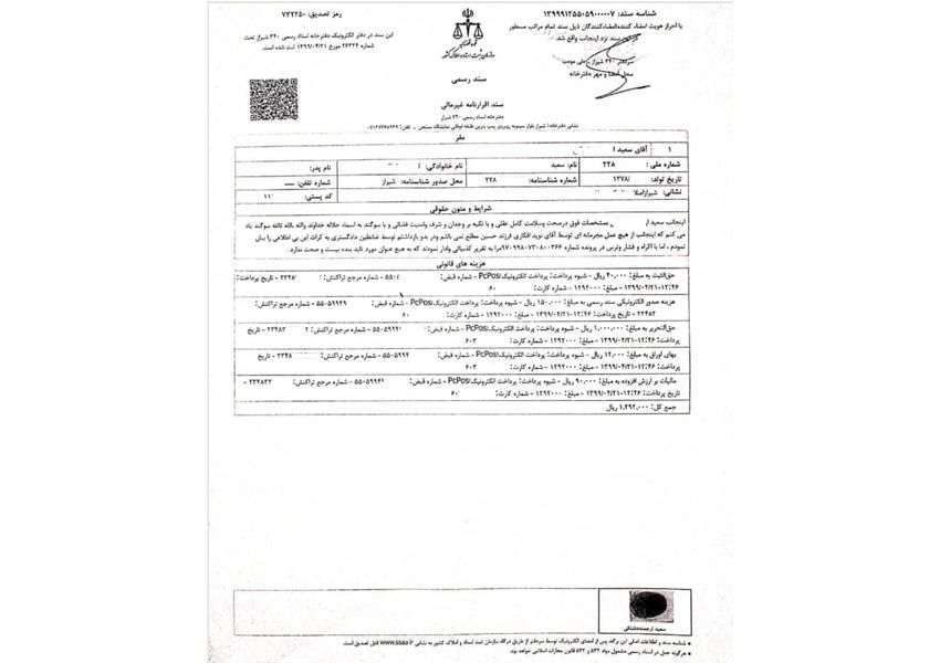 سعید ا...، چنین شهادت داده است: «در صحت و سلامت کامل عقلی و با تکیه بر وجدان و شرف و امنیت قضایی و با سوگند به اسماء جلاله خداوند والله بالله تالله سوگند یاد میکنم که اینجانب از هیچ عمل مجرمانهای توسط آقای نوید افکاری فرزند حسین مطلع نمیباشم و در بدو بازداشتم توسط ضابطین دادگستری به کرات این بیاطلاعی را بیان نمودم، اما با اکراه و فشار و ترس مرا به تقریر کذبیاتی وادار نمودند که به هیچ عنوان مورد تایید بنده نیست و صحت ندارد».