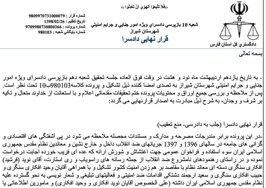 این ادعاها احتمالا به «قرار نهایی شعبه ۱۰ بازپرسی دادسرای ويژه امور جنايی و جرايم امنيتی شهرستان شيراز» اشاره دارد که با امضای بازپرس افشین محمدی درهشوری صادر شده است و در نهایت منجر به صدور دومین حکم اعدام برای نوید افکاری به اتهام محاربه به دست قاضی سید محمود ساداتی شده است.