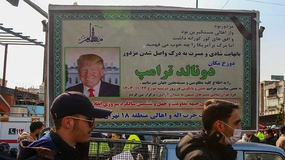 بر اساس تصاویر منتشرشده از راهپیمایی حکومتی ۲۲ بهمن در تهران، برگزارکنندگان اعلامیه ترحیمی برای دونالد ترامپ، رییس جمهوری آمریکا، طراحی و در مسیر راهپیمایی حامیان حکومت نصب کرده‌اند.