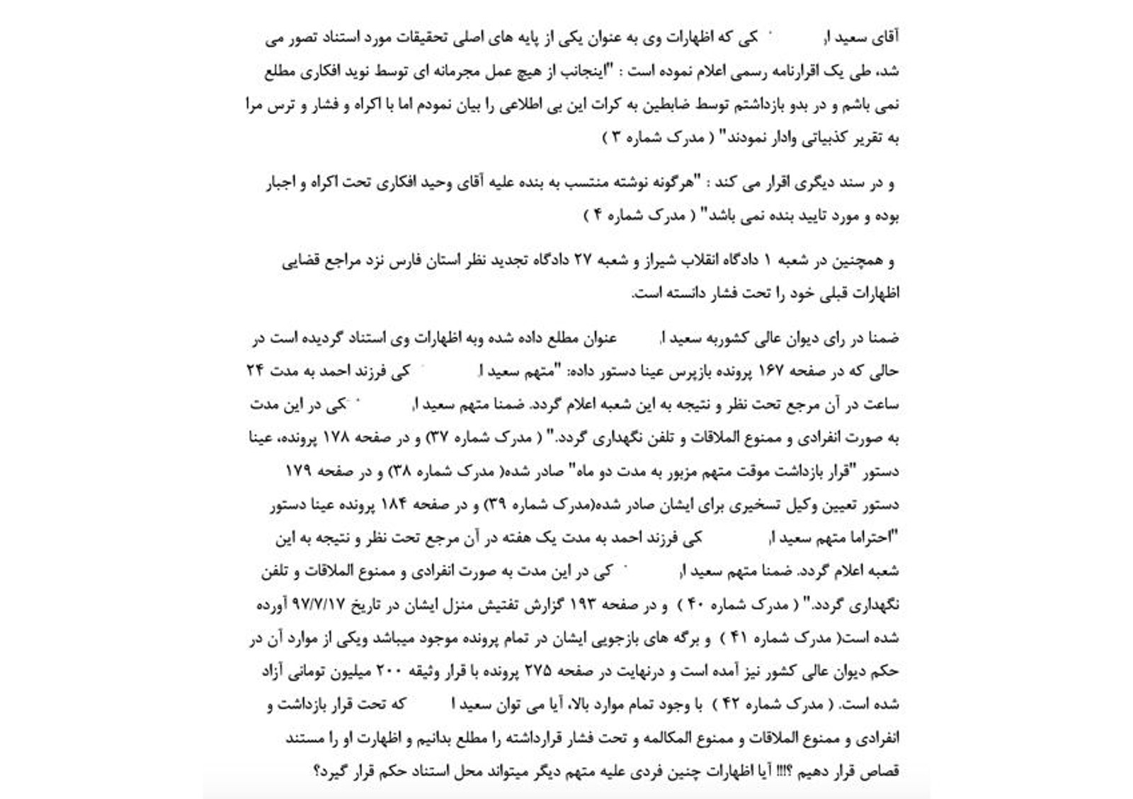 آقای سعید ا... در اقرارنامه دیگری بیان داشته است: «اینجانب سعید ا... در صحت و سلامت عقلی و با سوگند به اسماء جلاله خداوند والله بالله تالله سوگند یاد می‌کنم که آقای وحید افکاری فرزند حسین را تا قبل از جلسه دادگاه ندیده بودم و نمی‌شناختم و هرگونه نوشته منتسب به بنده بر علیه ایشان تحت اکراه و اجبار بوده و مورد تایید بنده نمی‌باشد.»