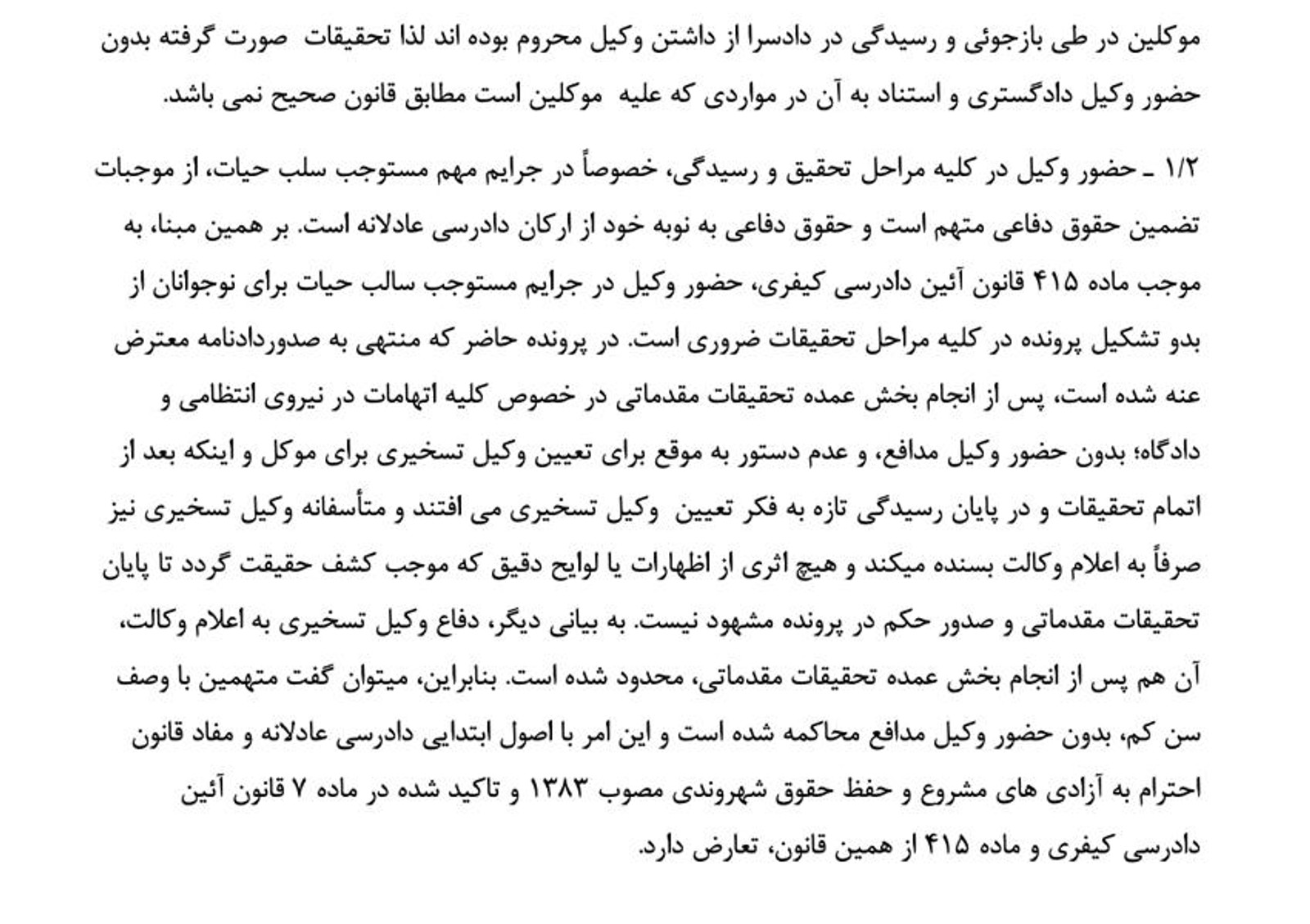 در دادگاه کیفری ۱ هم بر اساس فایل‌های صوتی منتشر شده، نوید و وحید افکاری وکلای تسخیری خود را عزل کرده و شخصا از خودشان دفاع کرده‌اند. به گفت خانواده، برادران افکاری در دادگاه کیفری ۲ هم وکیل نداشتند و خودشان هم در اعتراض به روند ناعادلانه دادرسی از خودشان دفاع نکردند: «حتی لایحه اعتراض به حکم دادگاه کیفری یک را برای ارائه به دیوان عالی کشور این دو برادر بر اساس متن کیفرخواست و حکم دادگاه و مهلت دو ساعته برای خواندن پرونده ۶۰۰ صفحه‌ای، شخصا و بدون وکیل تنظیم کردند» و به دیوان ارائه دادند.
