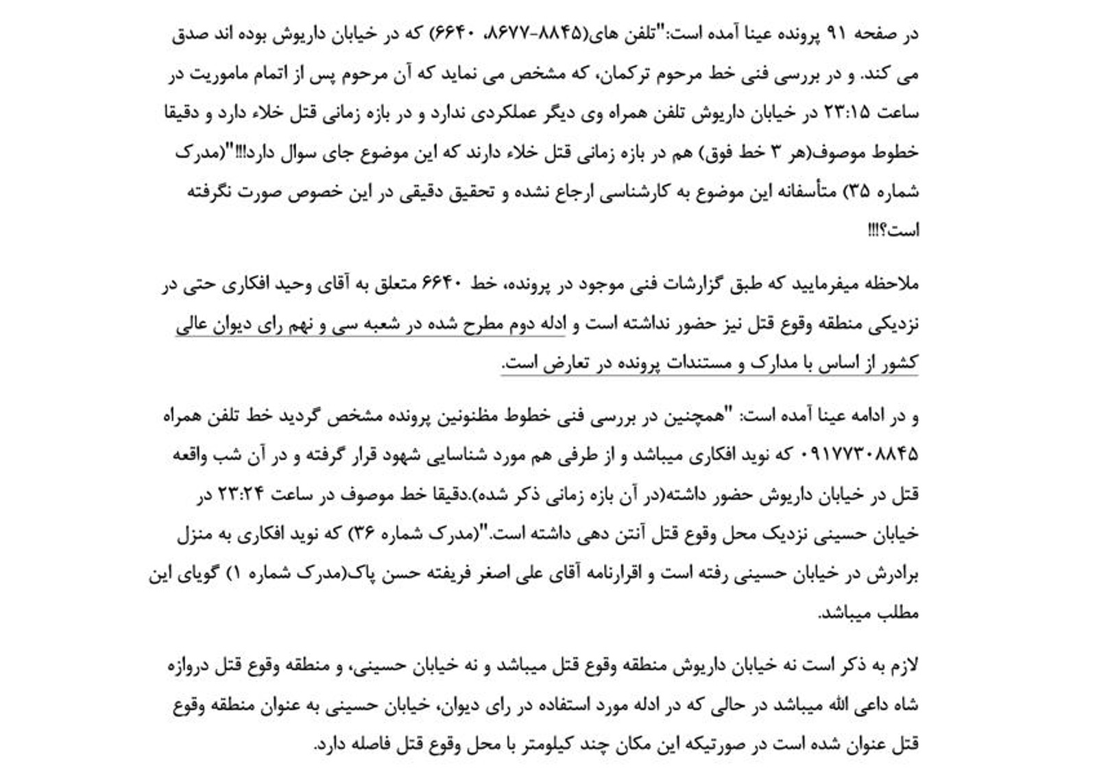 همچنین در صفحه ۹۱ پرونده آمده است: «در بررسی فنی خطوط مظنونین پرونده مشخص گردید خط تلفن همراه (۹۱۷۷۳۰۸۸۴۵) که متعلق به نوید افکاری می‌باشد … در ساعت ۹:۰۴ در خیابان حسینی نزدیک محل وقوع قتل آنتن دهی داشته است.» خیابان حسینی چند کیلومتر با محل قتل در در دروازه شاه داعی‌الله فاصله دارد.