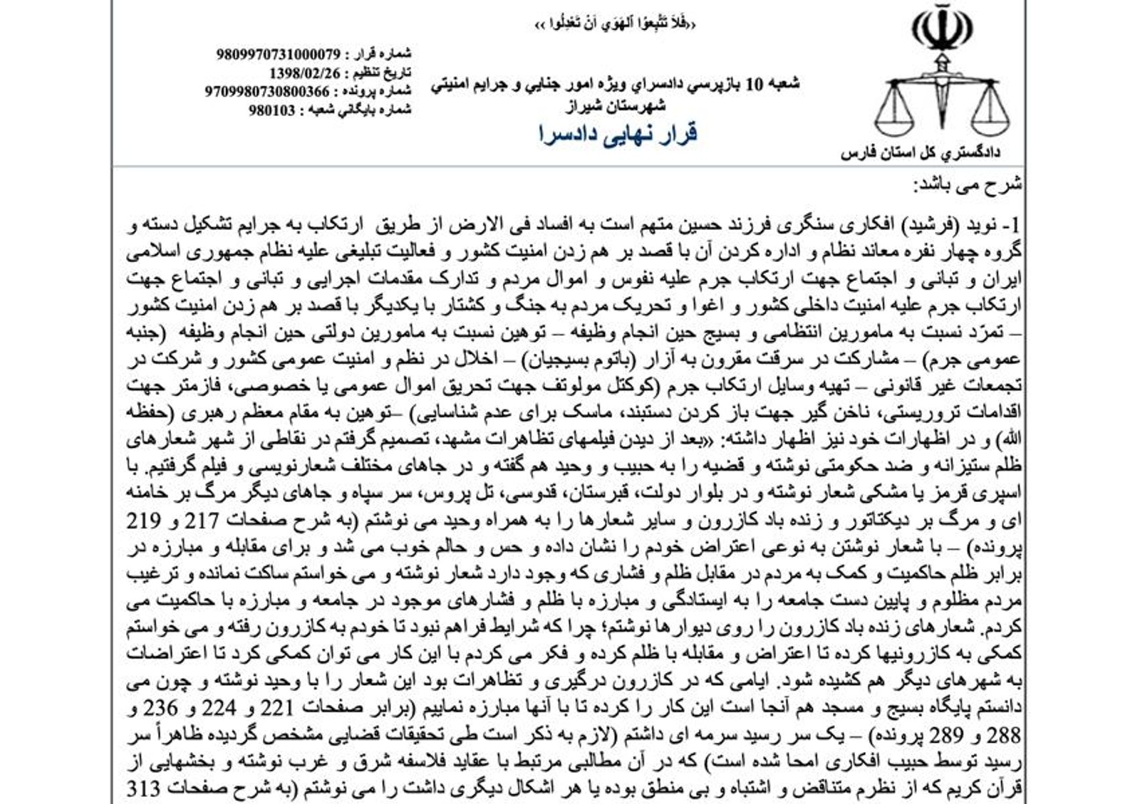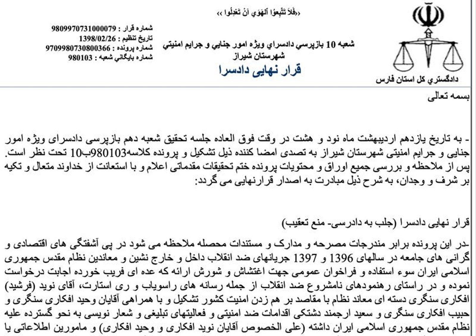 این ادعاها احتمالا به «قرار نهایی شعبه ۱۰ بازپرسی دادسرای ويژه امور جنايی و جرايم امنيتی شهرستان شيراز» اشاره دارد که با امضای بازپرس افشین محمدی دره‌شوری صادر شده است و در نهایت منجر به صدور دومین حکم اعدام برای نوید افکاری به اتهام محاربه به دست قاضی سید محمود ساداتی شده است.
