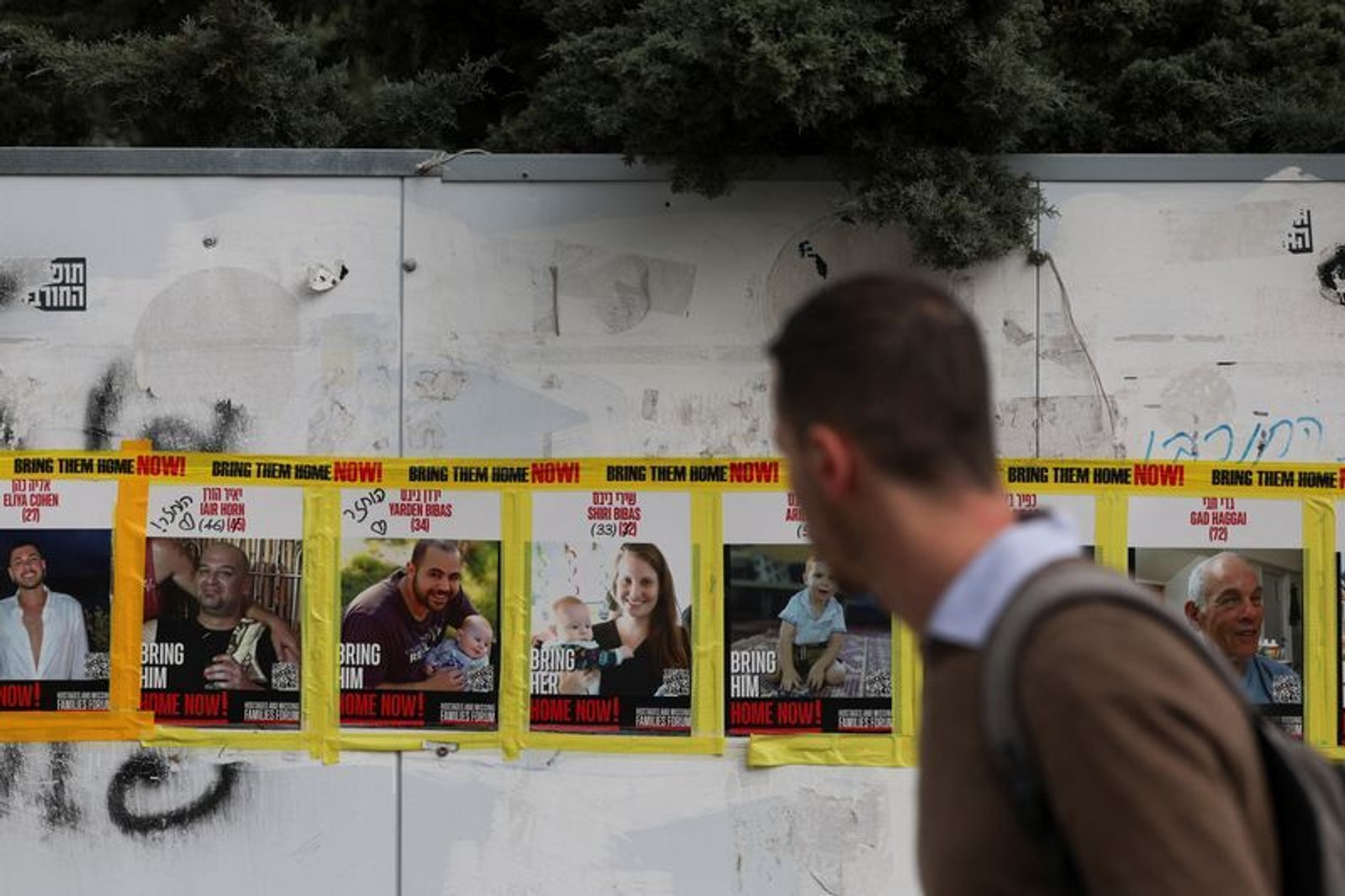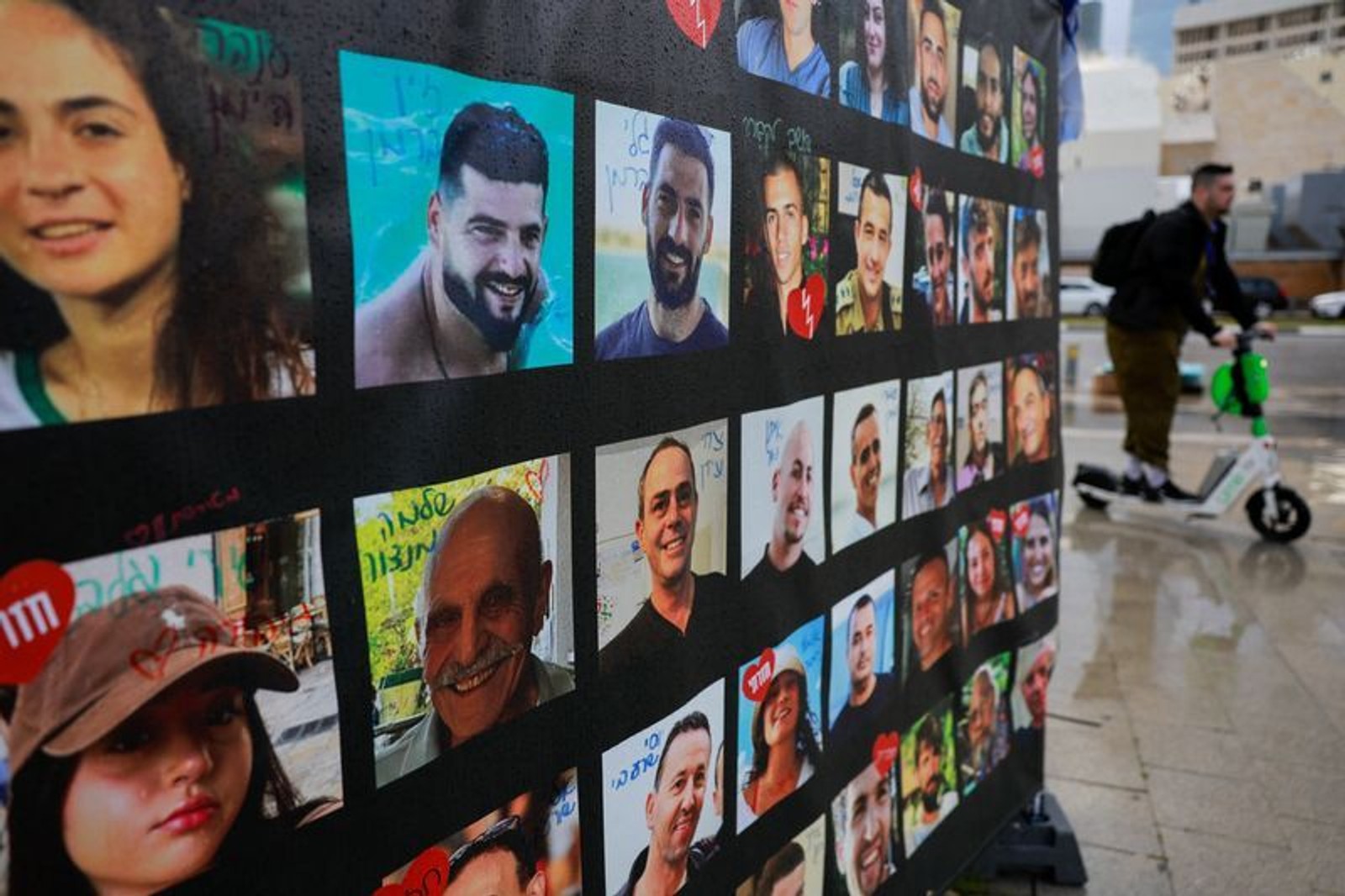 تصاویر شماری از گروگان‌های اسرائیلی در بند حماس در خیابانی در اورشلیم، اول اسفند
