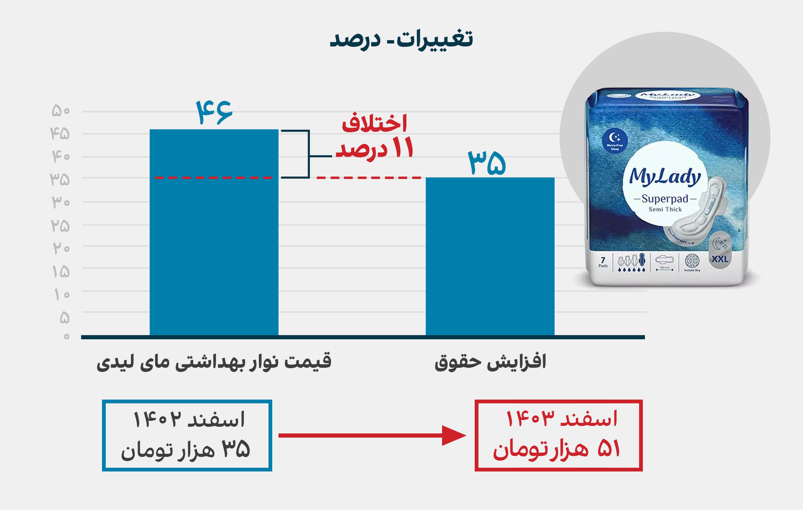 او درباره قیمت پد بهداشتی هم میگوید قیمت این محصول در فاصله اسفند ۱۴۰۲ تا اسفند ۱۴۰۳ از ۴۰ هزار تومان به ۷۷ هزار تومان رسیده است.