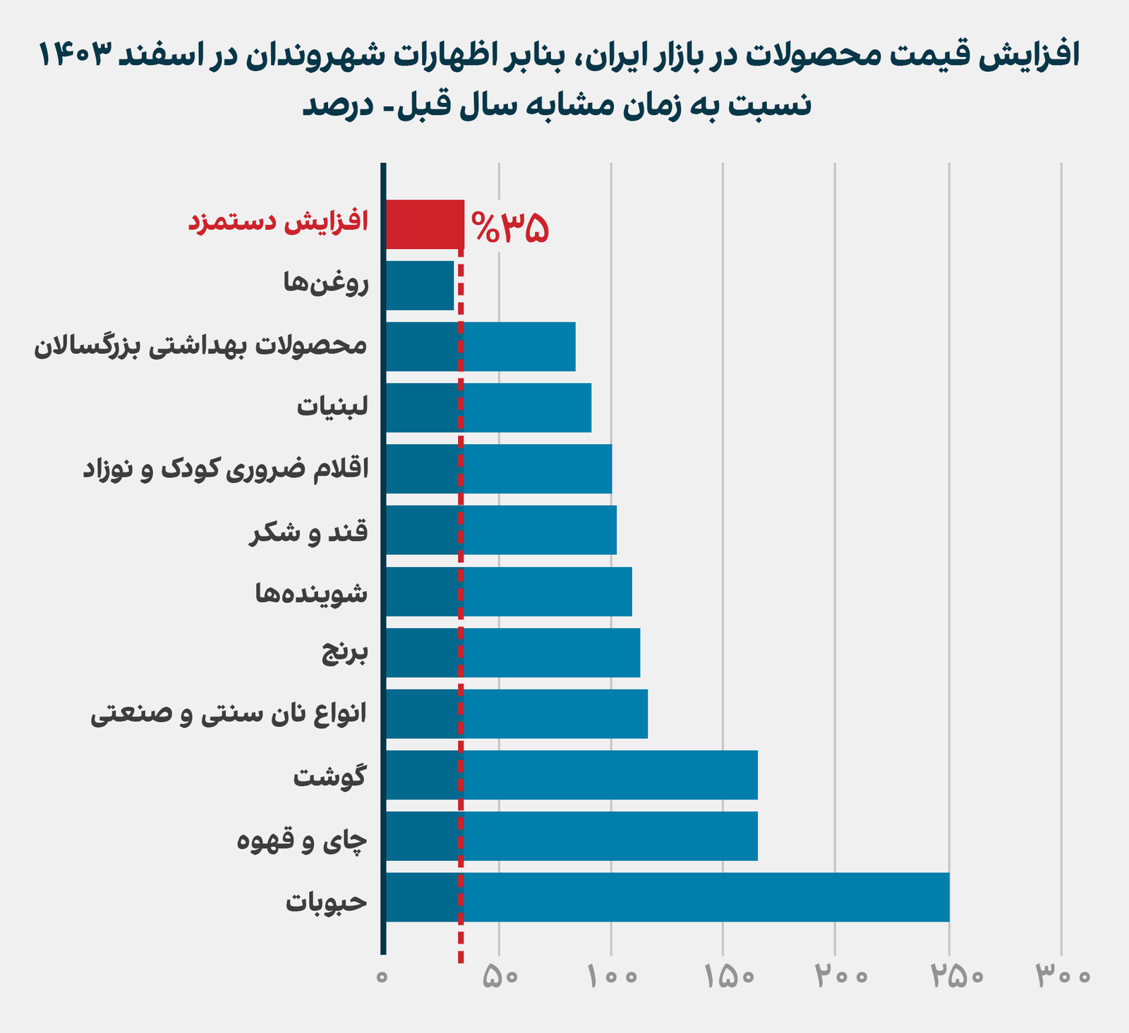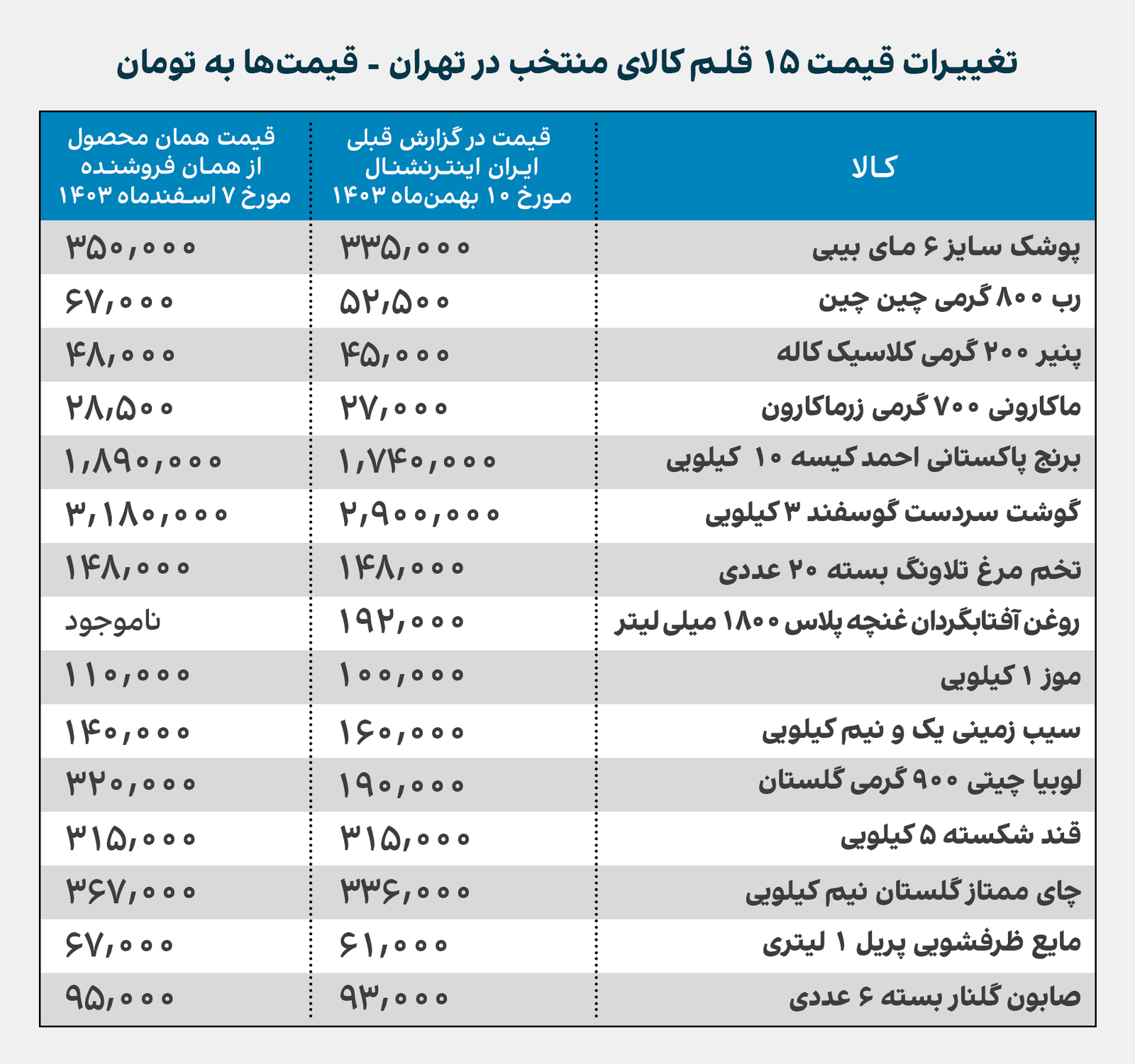قیمت مواد غذایی و اقلام مصرفی در فروشگاههای شهرهای تهران، شیراز، اصفهان، نوشهر، جاسک، قزوین، مشهد، تبریز، خرمآباد و کرمانشاه، نشان میدهد در هفته اول اسفندماه ۱۴۰۳، قیمت اقلام مصرفی خانوارها از ۲۲ تا ۳۶۰ درصد و به طور میانگین یکونیم برابر، معادل ۱۵۰ درصد افزایش داشته است.