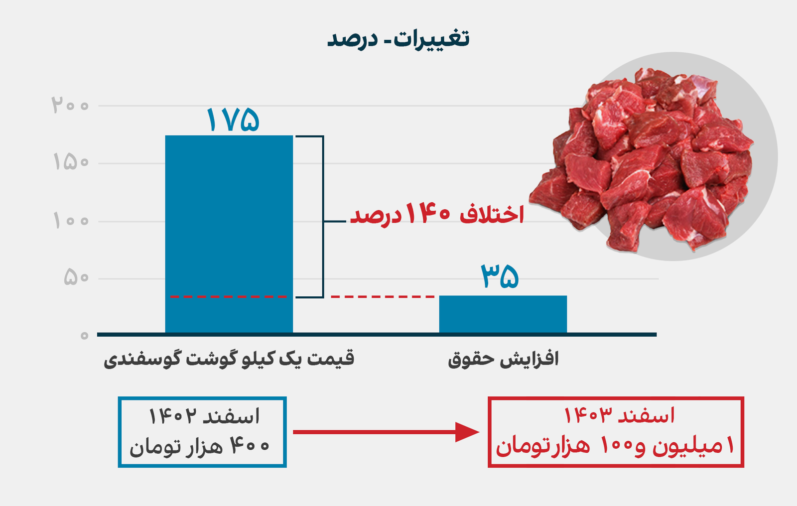 گوشت و برنج؛ در اقلام پرکاربردتر، قیمت یک کیلو گوشت گوسفندی که اسفند سال گذشته ۴۰۰ هزار تومان بود، اکنون به یک میلیون و ۱۰۰ هزار تومان رسیده است.
