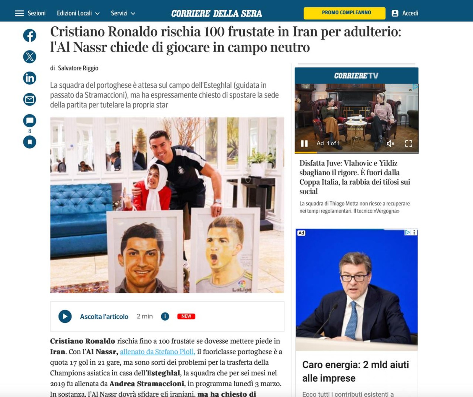 کوریره نوشته: «کریستیانو رونالدو اگر پا به ایران بگذارد ممکن است با ۱۰۰ ضربه شلاق مجازات شود. در حاشیه بازی با پرسپولیس، تصاویری از کریستیانو رونالدو در حال بغل کردن و بوسیدن پیشانی فاطمه حمامی نصرآبادی، هنرمند معلولی که با پاهای خود نقاشی می‌کند، منتشر شد.»