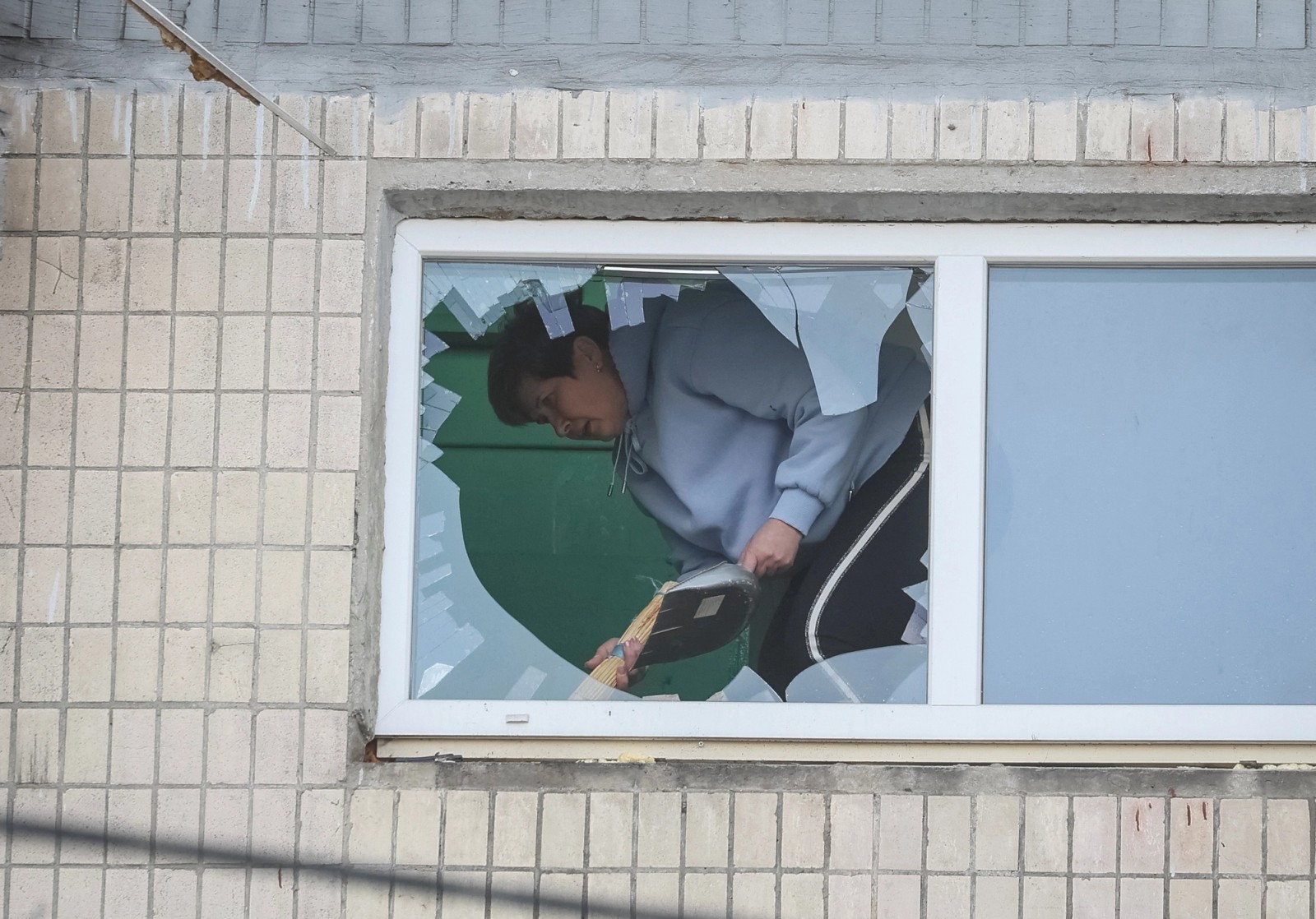 شکسته شدن شیشه یک واحد مسکونی در کی‌یف در حمله پهپادی ارتش روسیه، سوم فروردین