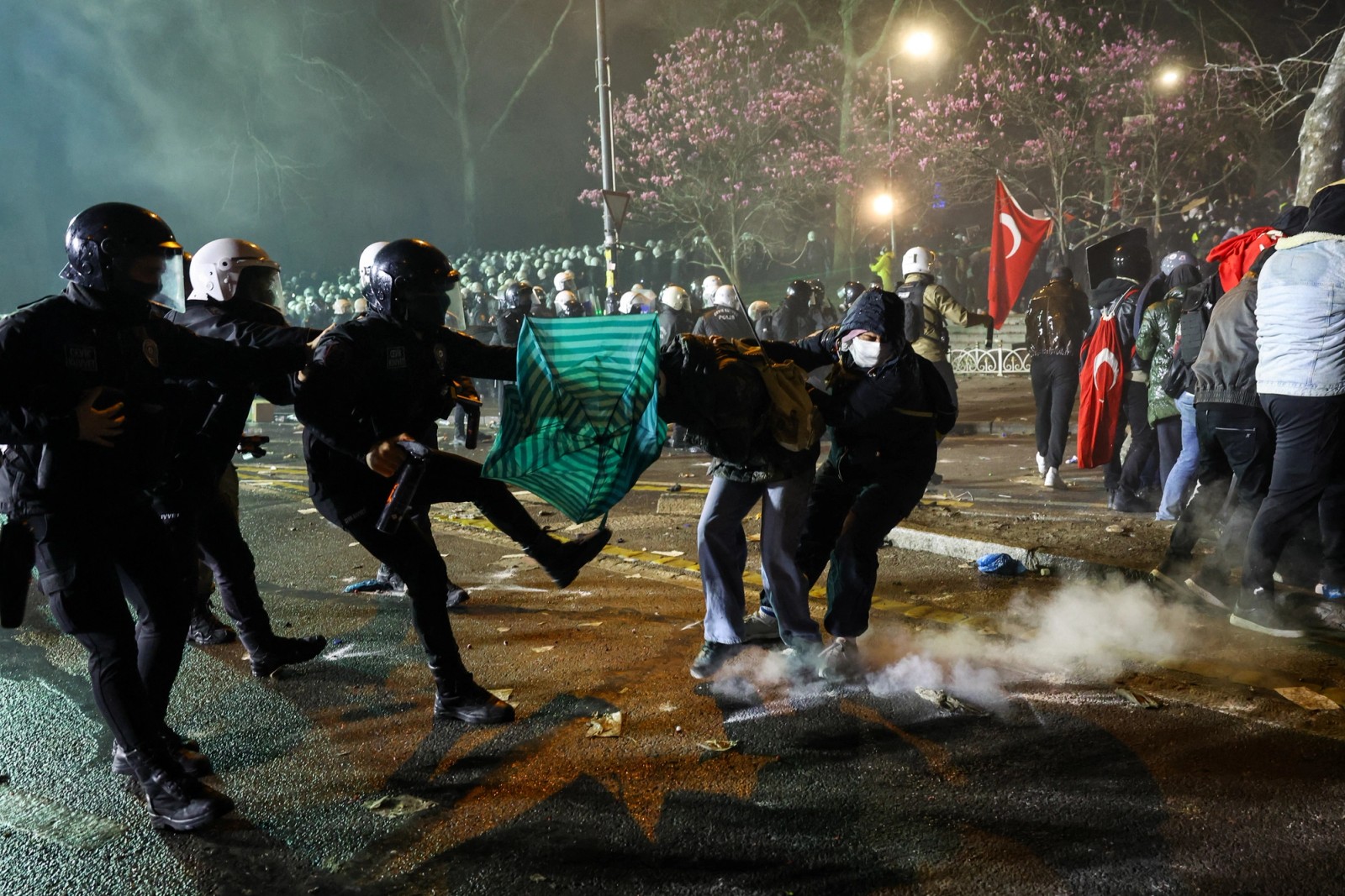 معترضان در مواجهه با شلیک گاز اشک‌آور پلیس، پشت پرچم ترکیه پناه گرفته‌اند