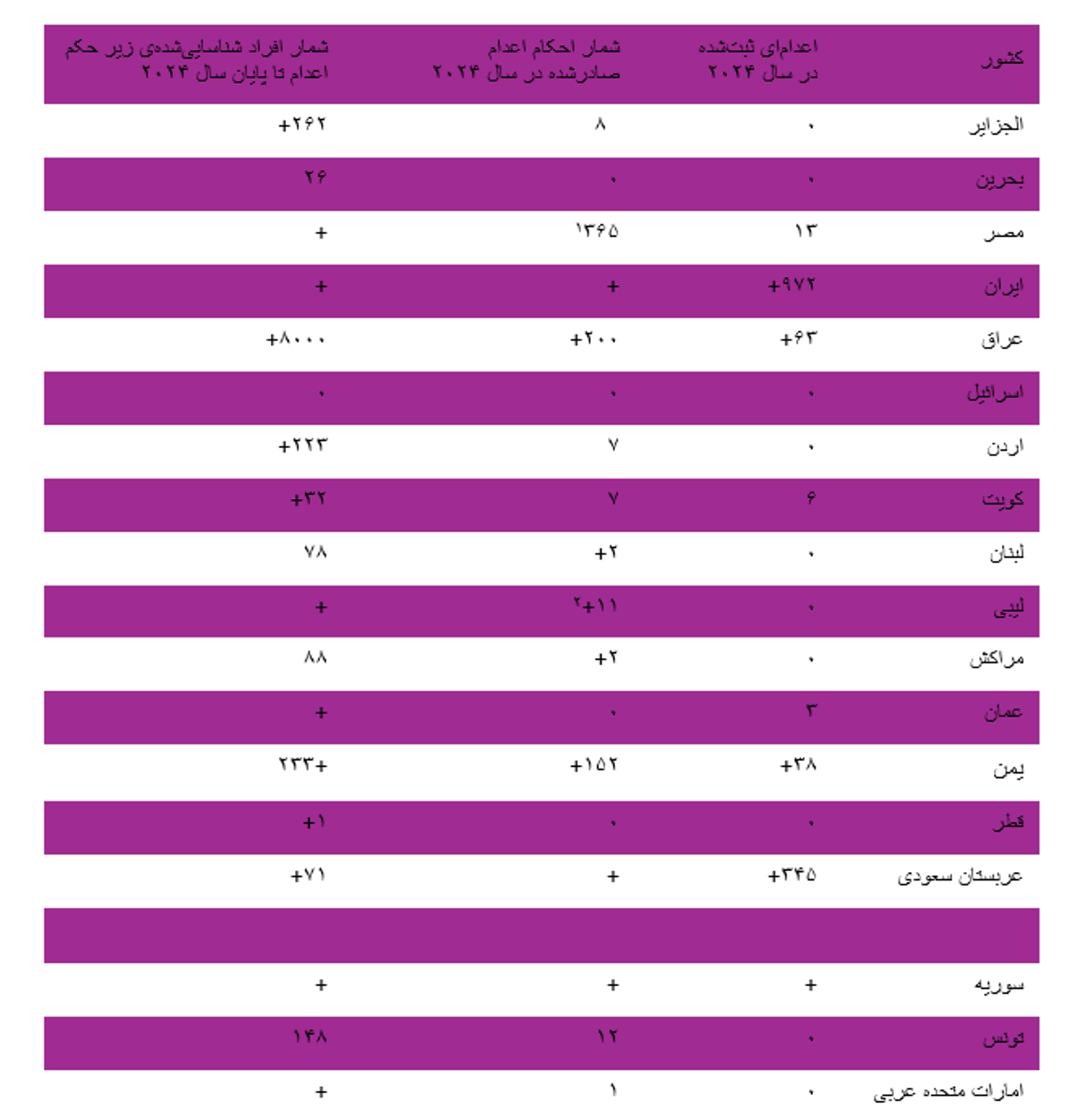 در مجموع، منطقه خاورمیانه و شمال آفریقا با ثبت دست‌کم ۱۴۴۲ اعدام، بیش از ۹۵ درصد از اعدام‌های جهان را در خود جای داده است. این رقم بالاترین میزان در بیش از یک دهه گذشته بوده است.