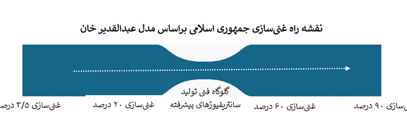 فرایند غنیسازی اورانیوم در جمهوری اسلامی، بر پایه نقشه راهی طراحی شده که از مدل عبدالقدیر خان، پدر برنامه هستهای پاکستان، الهام گرفته است، مسیری پلکانی و مرحله به مرحله که با غنیسازی ۳.۵ درصدی برای مصارف نیروگاهی آغاز شد.