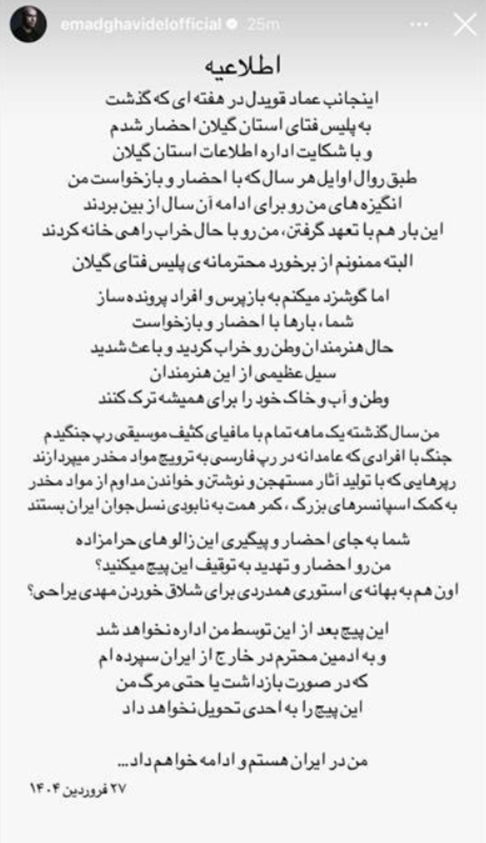 عماد قویدل، خواننده رپ اعتراضی، با انتشار یک استوری در صفحه اینستاگرامیش، نوشت پس از اینکه با شکایت ادارهکل اطلاعات گیلان به پلیس فتای این استان احضار شده، از او تعهد گرفتهاند دیگر در شبکههای اجتماعی علیه نظام جمهوری اسلامی فعالیت نکند، تا صفحه اینستاگرامش توقیف نشود.