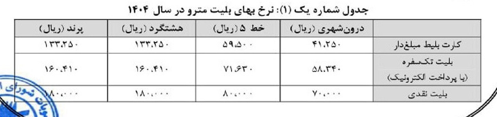 بر اساس مصوبه شورای شهر تهران، نرخ هر سفر درونشهری مترو تهران با کارت بلیت مبلغدار به چهار هزار و ۱۲۵ تومان، نرخ بلیت تکسفره به پنج هزار و ۸۳۴ تومان و نرخ بلیت نقدی به هفت هزار تومان افزایش پیدا کرده است.