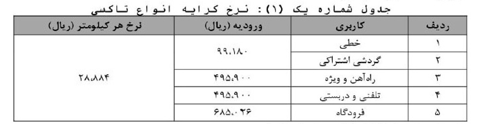 نرخ ورودی برای تاکسیهای «راهآهن و ویژه» و «تاکسی تلفنی» ۴۹ هزار و ۵۹۰ تومان و برای تاکسیهای فرودگاه، ۶۸ هزار و ۵۰۲ تومان خواهد بود.