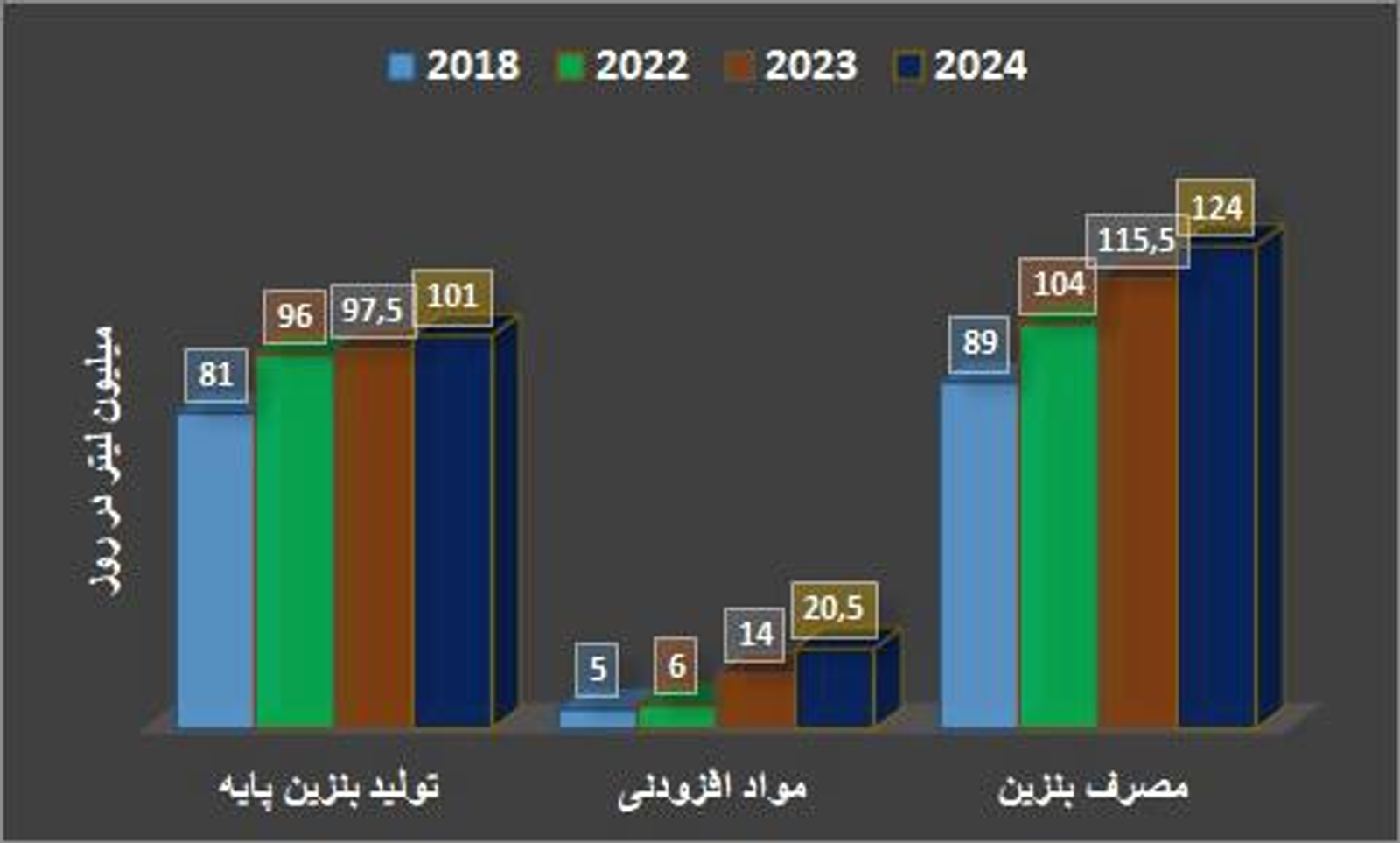 تولید روزانه بنزین پایه در سال ۲۰۲۴ حدود ۱۰۱ میلیون لیتر بوده، در حالی که مصرف به ۱۲۳ میلیون لیتر در روز رسیده است.