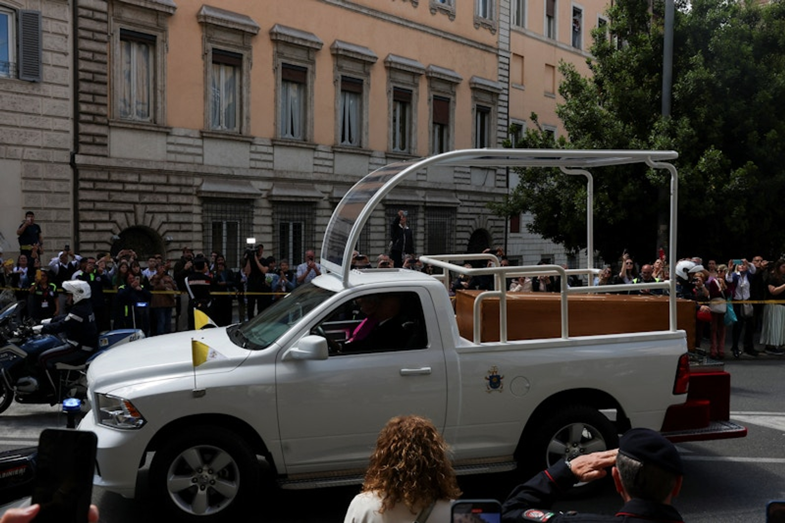 به گزارش رویترز از محل مراسم، با عبور پاپاموبیل (اتوموبیل مخصوص پاپ) حامل تابوت، خیابان‌ها شلوغ‌تر شده و تقریبا همه‌ حاضران، موبایل‌هایشان را بالا گرفته‌اند تا از این لحظه عکس بگیرند.
