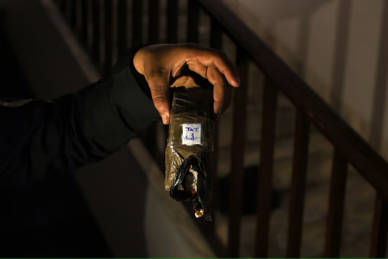 یک جنگجوی هیات تحریرالشام یک بمب خنثیشده C-4 را در دست دارد که در سفارت تهران در دمشق پیدا شده است