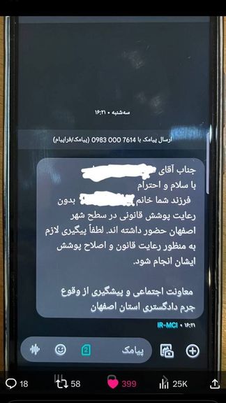 از اواخر فروردین ۱۴۰۴، تحول در اجرای سیاست حجاب اجباری لایههای تازهای از ترس، ابهام و بیاعتمادی را به جامعه تحمیل کرد: ارسال پیامک درباره تخلف ادعایی زنان از قانون حجاب که در مواردی برای مردان خانواده فرستاده شده است.